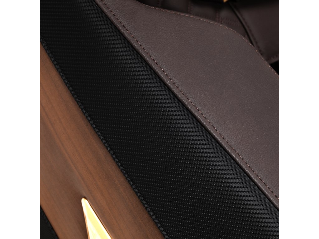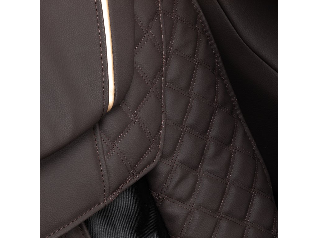 Sedacia časť stoličky je potiahnutána dotyk príjemná imitácia kože v tmavohnedom odtieni. Tento materiál sa vyznačujevysoká odolnosť voči vlhkosti a jednoduché čistenie, čo zaručuje pohodlné používanie. Pozornosť upúta kombinácia syntetickej kože imitujúcej drevo s textúrovaným materiálom na vonkajších častiach stoličky,dodáva celku originálny a elegantný vzhľad. Starostlivo vykonané šitie zdôrazňuje štýlový dizajn a pevná konštrukciazaručuje životnosť na dlhé roky. Kompaktný model s estetickou povrchovou úpravou dokonale zapadne do každého interiéru. Masážne kreslo Sakura 306A jedokonalé riešenie pre chvíle oddychu - najmä po náročnom dni alebo intenzívnom tréningu.