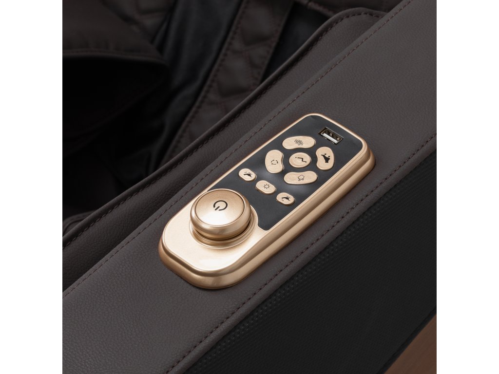 Kreslo je vybavenétlačidlá na ľavej lakťovej opierke, ktoré umožňujú pohodlné ovládanie nastavení. Zabudované praktické diaľkové ovládanieumožňuje nastaviť niektoré parametre masáže, polohu kresla, masáž chodidiel alebo funkciu Zero Gravity kedykoľvek počas ošetrenia. Pre ešte väčšie pohodlie má kresloPort USB, ktorá umožňuje nabíjať telefón počas používania.