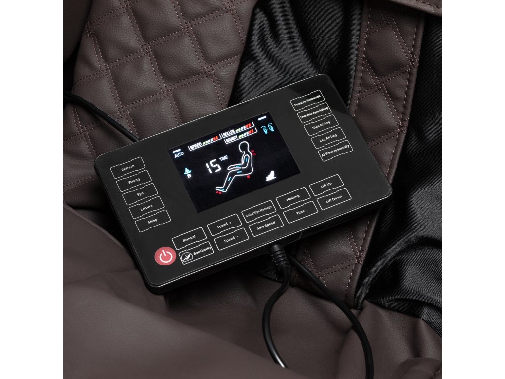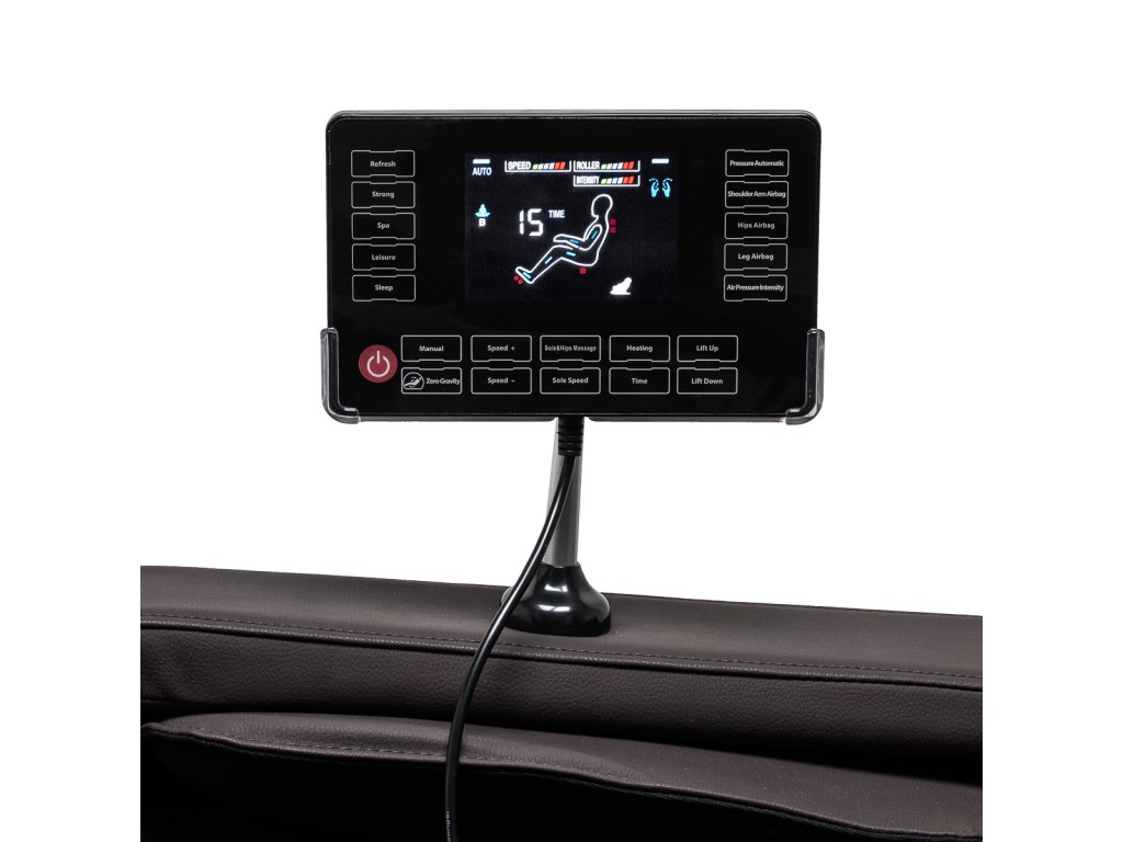 Prehľadný ovládací panel s LCD displejomzabezpečuje jednoduché a intuitívne ovládanie stoličky. Panel môžete pohodlne umiestniť na rukoväť umiestnenú na pravej lakťovej opierke alebo ho držať v rukách. Prehľadný displejzobrazuje aktuálnu prevádzku zariadeniavrátane masírovaných oblastí tela, intenzity masáže, času ošetrenia a zvoleného programu. Panel umožňuje presné nastavenie nastavení kresla a masážnych funkcií, ako ajvybrať dĺžku relácie, ktoré môžu trvať 5, 10, 15, 20, 25 alebo 30 minút.
