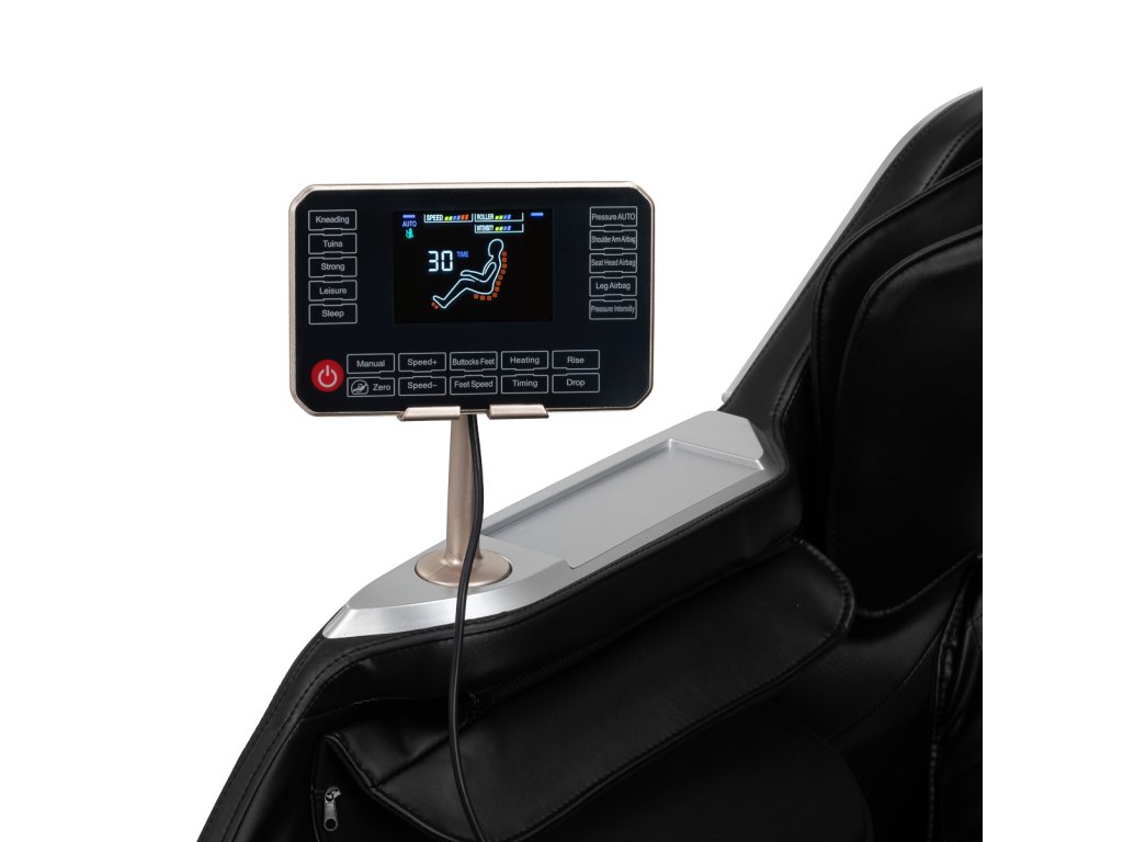 Prehľadný ovládací panels ľahko čitateľným LCD displejom zabezpečuje intuitívne ovládanie stoličky. Možno ho pohodlne umiestniť do rukoväte na pravej opierke alebo držať v ruke. Displej predstavujeinformácie o práve masírovanej časti tela, intenzitu, trvanie sedenia a zvolený program. Pomocou panela môžete ľahko nastaviť polohu kresla, vybrať preferovaný masážny režim anastavenie času liečby - 15, 20, 25 alebo 30 minút.