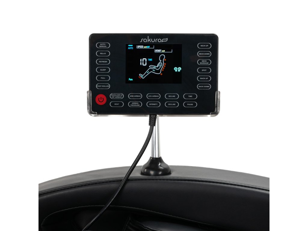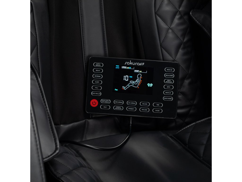 Prehľadný ovládací panel uľahčuje a spríjemňuje používanie kresla. Pre väčšie pohodlie ho možno umiestniť na rukoväť umiestnenú na pravej podrúčke alebo držať v rukách. Činnosť zariadenia možno sledovať naprehľadný LCD displej; jasne sa zobrazujú oblasti tela, kde sa masáž v danom okamihu vykonáva, jej intenzita, čas ošetrenia a zvolený program. Panel umožňuje výber masážneho programu,voľne upravovať nastavenia kresla a masážnych funkcií, upravte intenzitu a nastavte trvanie ošetrenia,ktoré môžu trvať 15, 20, 25 alebo 30 minút.