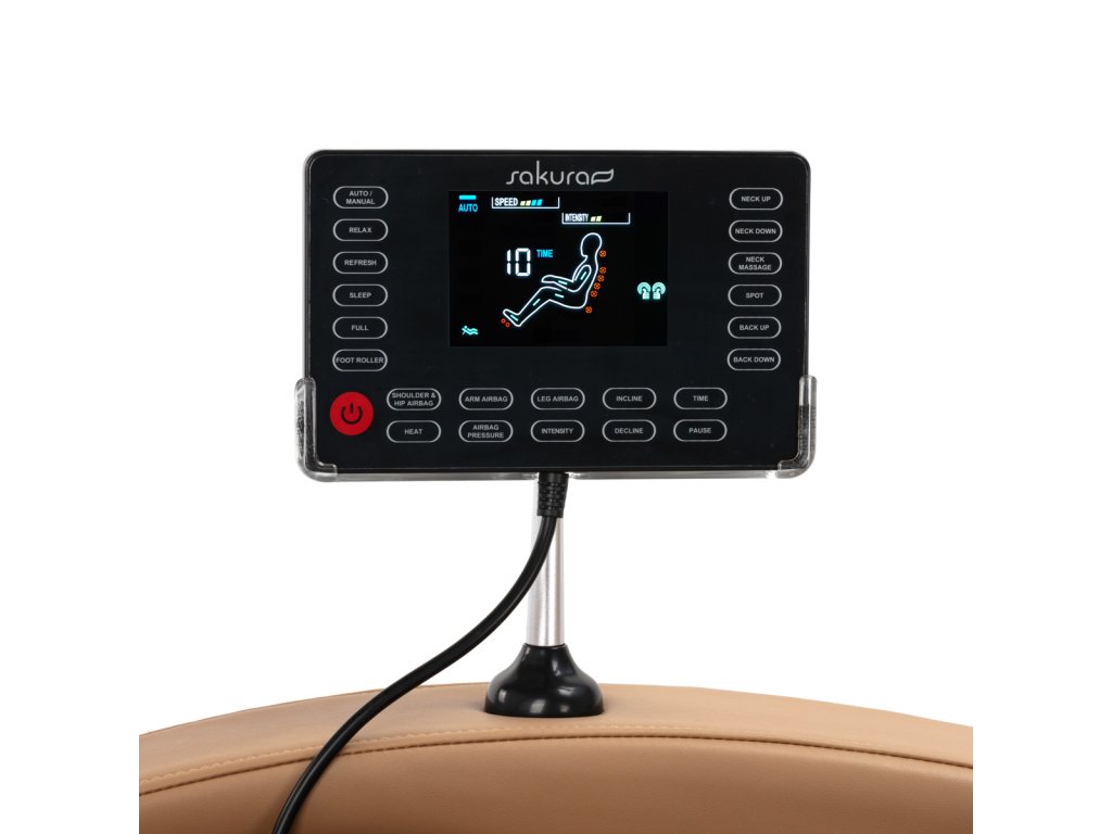 Prehľadný ovládací panel uľahčuje a spríjemňuje používanie kresla. Pre väčšie pohodlie ho možno umiestniť na rukoväť umiestnenú na pravej podrúčke alebo držať v rukách. Činnosť zariadenia možno sledovať naprehľadný LCD displej; jasne sa zobrazujú oblasti tela, kde sa masáž v danom okamihu vykonáva, jej intenzita, čas ošetrenia a zvolený program. Panel umožňuje výber masážneho programu,voľne upravovať nastavenia kresla a masážnych funkcií, upravte intenzitu a nastavte trvanie ošetrenia,ktoré môžu trvať 15, 20, 25 alebo 30 minút.