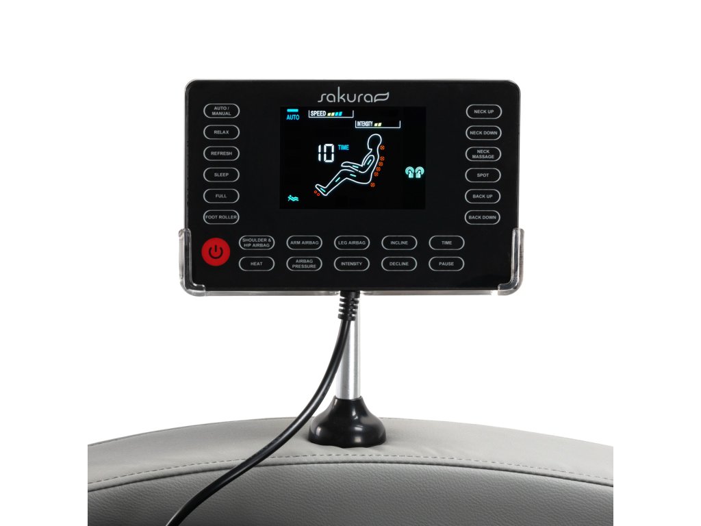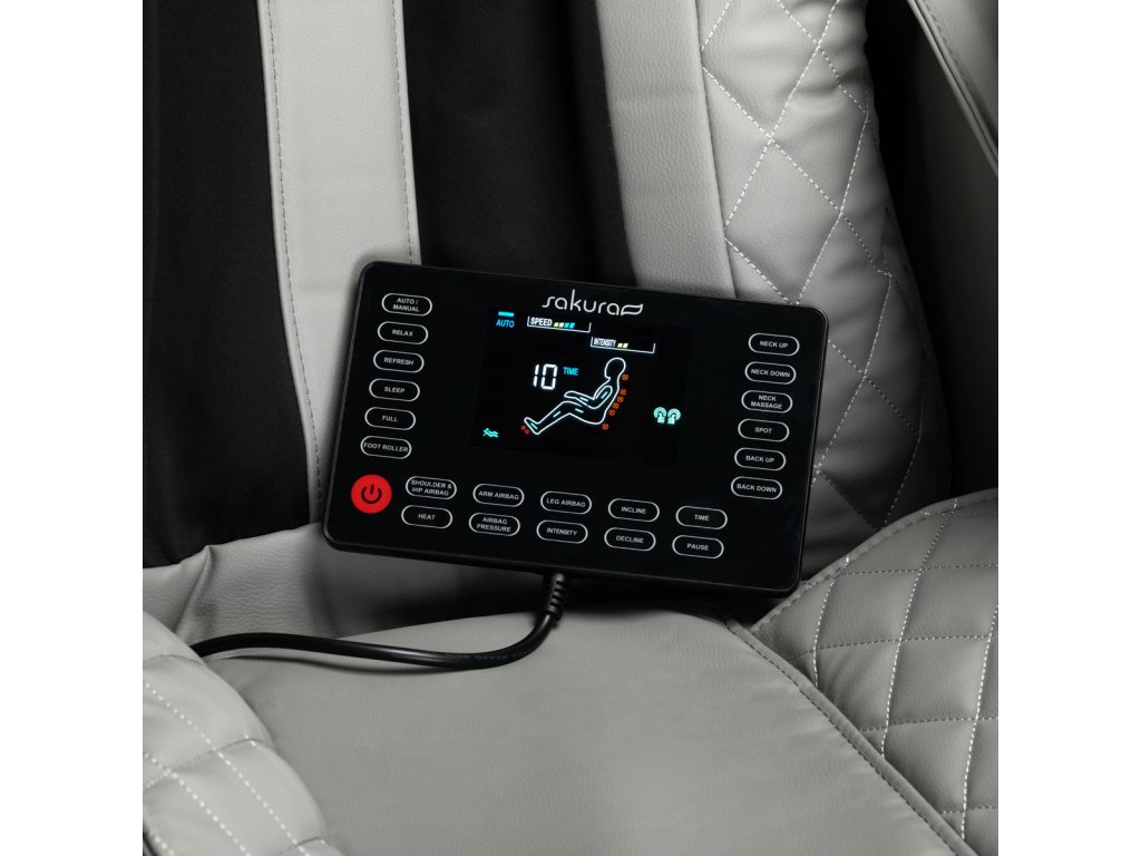 Prehľadný ovládací panel uľahčuje a spríjemňuje používanie kresla. Pre väčšie pohodlie ho možno umiestniť na rukoväť umiestnenú na pravej podrúčke alebo držať v rukách. Činnosť zariadenia možno sledovať naprehľadný LCD displej; jasne sa zobrazujú oblasti tela, kde sa masáž v danom okamihu vykonáva, jej intenzita, čas ošetrenia a zvolený program. Panel umožňuje výber masážneho programu,voľne upravovať nastavenia kresla a masážnych funkcií, upravte intenzitu a nastavte trvanie ošetrenia,ktoré môžu trvať 15, 20, 25 alebo 30 minút.
