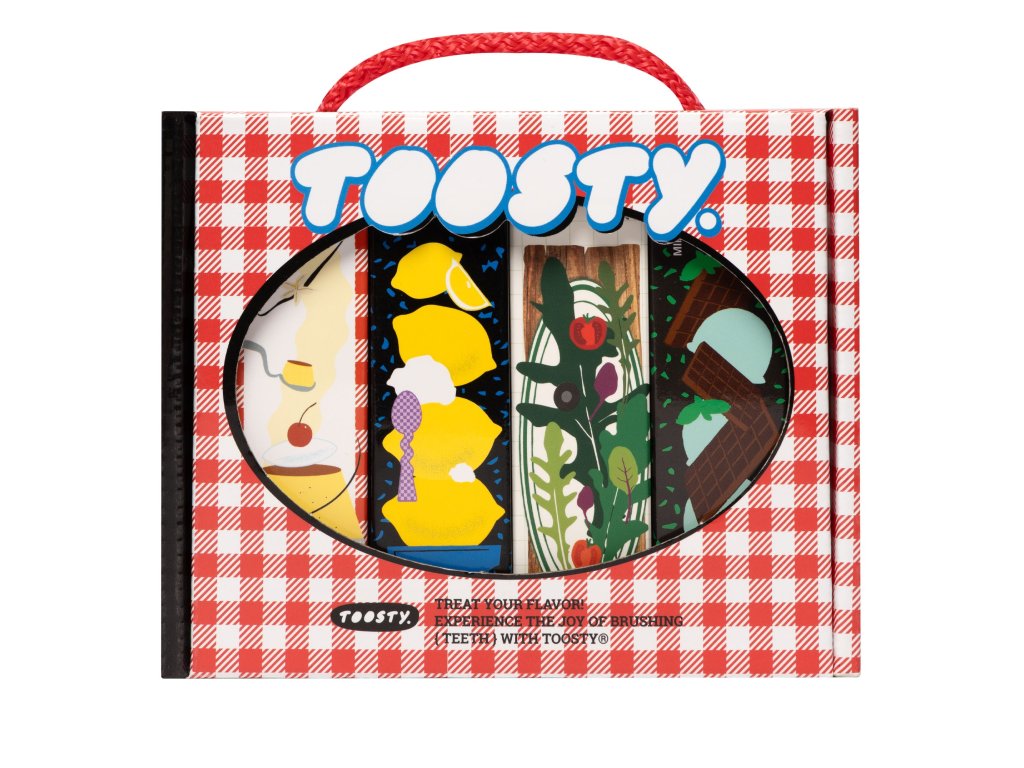 Je to ťažká voľba, však?Toto balenie štyroch zubných pást Toosty je úžasným darčekom, ale je tiež skvelé na cestovanie alebo na vyskúšanie všetkých výnimočných príchutí, ktoré značka ponúka. Kolekcia zábavných zubných pást pre tých, ktorí sa nechcú uspokojiť s plochou, nudnou chuťou. Toto balenie prináša do starostlivosti o ústnu dutinu vzrušenie z jedinečných zubných pást s neobvyklými príchuťami.???*Použitie*Použite toto balenie zubných pást na vyskúšanie celého radu Toosty. Vyskúšajte širokú škálu príchutí pre jedinečný zážitok z ústnej starostlivosti.??? ???*Zloženie*Zubná pasta s pudingomAqua (voda), sorbitol, glycerín, xylitol, oxid kremičitý, fluorid sodný, karboxymetylcelulóza sodná, steviozid, oxid titaničitý, mlieko, extrakt z listov Camellia Sinensis (zelený čaj), extrakt z kvetov Calendula Officinalis, Výťažok z kvetov harmančeka pravého (Matricaria Recutita), výťažok z aloe barbadensis, výťažok zo šalvie lekárskej (Salvia Officinalis), olej z avokáda (Persea Gratissima), mentol, olej z mäty piepornej (Mentha Pulegium), aróma, výťažok z plodov gardénie jasmínovej (Gardenia Jasminoides), maltodextrín, lauroylsarkosinát sodný, Sodium Cocoyl IsethionateZubná pasta Citrónový sorbetAqua (voda), glycerín, oxid kremičitý, sodium Lauroyl Sarcosinate, hydrogen Peroxide, Tocopherol Acetate, Sodium Carboxymethylcellulose, Xanthan gum, Xylitol, Stevioside, Sodium Benzoate, Citrus Aurantium (Bitter Orange) Peel Extract, EDTA disodná soľ, kyselina citrónová, citrát sodný, alanín, extrakt z kvetu Chamomilla Recutita (Matricaria), extrakt z rozmarínu lekárskeho (Rosmarinus Officinalis), mentol, olej z kôry citróna (Citrus Lemon Peel), olej z grapefruitu (Citrus Paradisi), aróma, kokoylglutaman sodnýMätová zubná pastaUhličitan vápenatý, Aqua (voda), glycerín, sorbitol, sodná soľ karboxymetylcelulózy, lauroylsarkozinát sodný, oxid kremičitý, dihydrát difosforečnanu vápenatého, chlórhydroxyalantoinát sodný, monofluórfosforečnan sodný, hydroxyapatit, xylitol, steviozid, zmes dreveného uhlia a manitolu ba ll, Mentol, výťažok zo šalvie, výťažok z harmančeka, výťažok z aloe, mentolový olej Pulegium, aróma, zmes zelených, CI 42090, výťažok z Theobroma Cacao, sodium cocoyl glutamateZubná pasta RucolaAqua (voda), sorbitol, oxid kremičitý, glycerín, xylitol, sodná soľ karboxymetylcelulózy, Monofluórfosforečnan sodný, Pyrofosforečnan sodný, Acetát tokoferolu, Steviozid, Extrakt z listov Olea Europaea, Extrakt z petržlenu (Carum Petroselinum), Extrakt zo zeleného čaju (Camellia Sinensis), Extrakt zo šalvie lekárskej (Salvia Officinalis), Aloe Barbadensis Extract, Lactuca Scariola Sativa Leaf Extract, Rosmarinus Officinalis (Rozmarín) Leaf Extract, Calendula Officinalis Flower Extract, Menthol, Aroma, Gardenia Jasminoides Fruit Extract, Hydrolyzed Gardenia Florida Extract, Sodium Lauroyl Sarcosinate??? ???*Ako používať*Zubná pasta s pudingom z kustovnicePribližne 2 minúty čistite zuby. Dôkladne opláchnite vodou, kým sa neodstráni všetka zubná pasta. *Neodporúča sa pre deti mladšie ako 6 rokov.zubná pasta Lemon SorbetZuby si čistite približne 2 minúty. Dôkladne opláchnite vodou, kým sa neodstráni všetka zubná pasta. *Neodporúča sa pre deti mladšie ako 6 rokov.Mätovo-čokoládová zubná pastaŠetrite si zuby približne 2 minúty. Uistite sa, že ste zuby dôkladne vypláchli vodou, kým sa neodstráni všetka zubná pasta. *Neodporúča sa používať deťom mladším ako 6 rokov.Rucola zubná pastaŠetrite si zuby približne 2 minúty. Uistite sa, že ste zubnú pastu dôkladne vypláchli vodou, kým sa neodstráni všetka zubná pasta. *Neodporúča sa používať deťom mladším ako 6 rokov.???