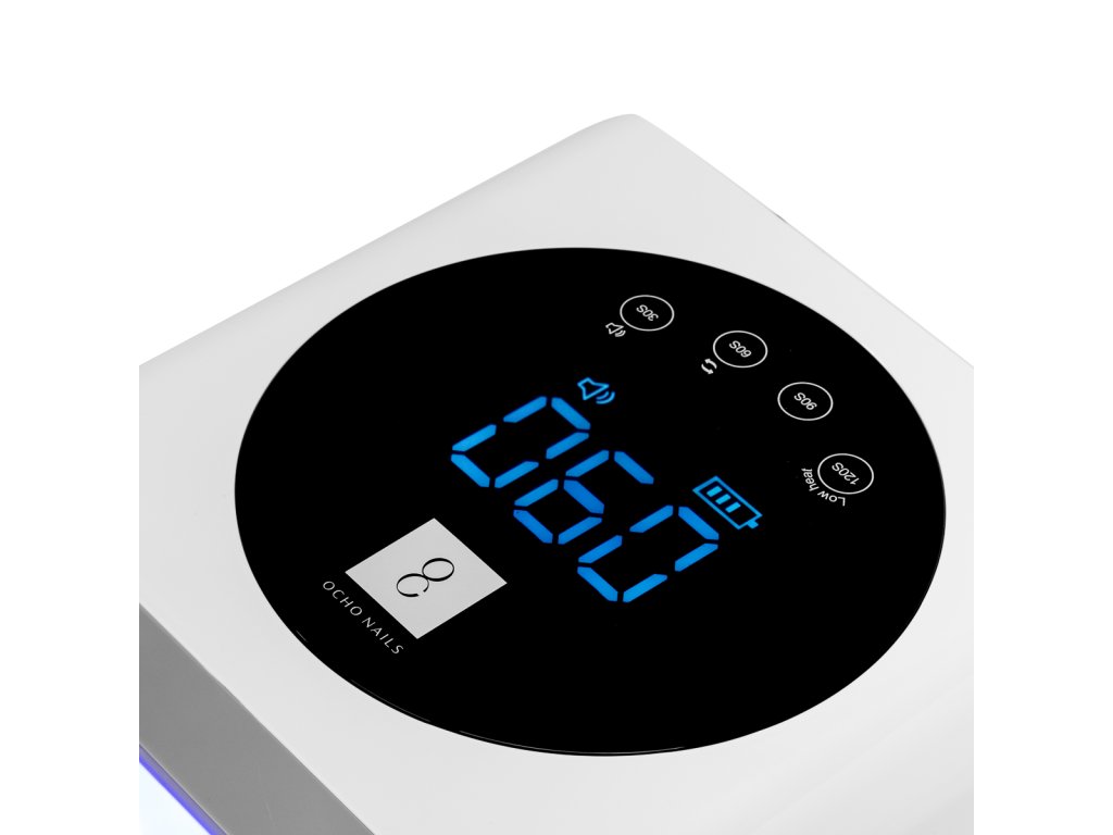 Svietidlo je vybavenéčasovač so štyrmi naprogramovanými časmi: 30 s, 60 s, 90 s a 120 s (tzv. "režim nízkeho ohrevu"), ktoré sa zobrazujú na prehľadnom digitálnom displeji. Azabudovaný snímač pohybu automaticky aktivuje lampu, keď sa pod ňu položia prsty na rukách alebo nohách, za predpokladu, že120 sekúnd ako maximálny expozičný čas. Táto funkcia funguje, keď nie je zvolený žiadny režim a na displeji sa zobrazuje čas vytvrdzovania. To umožňujevoľné nastavenie času expozície k práve vykonávanému stylingu.