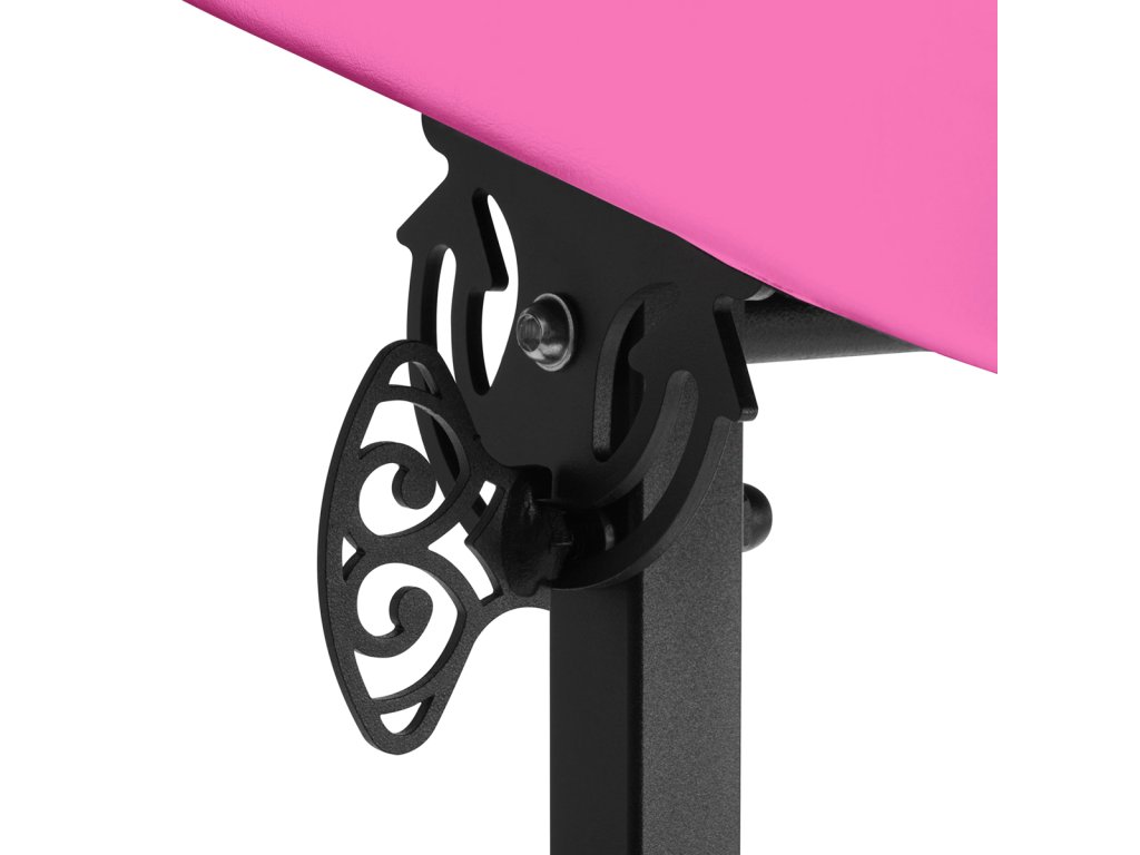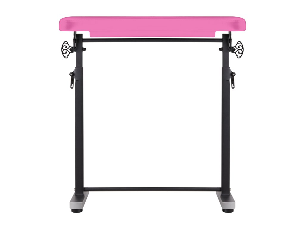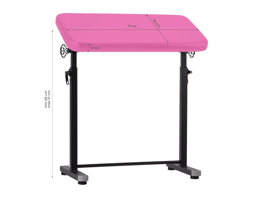 Pevný čierny rám z kovu zaručuje stabilita a odolnosť opierky na ruku, ktorá je pri práci tatéra mimoriadne dôležitá. Čalúnenie zo syntetickej kože v ružových odtieňoch uľahčuje čistenie zariadenia.Moderný dizajn zatraktívnia interiér tetovacieho salónu a zdôraznia jeho jedinečný charakter.Kombinácia pohodlia, funkčnosti a štýlu ktoré určite uspokoja profesionálov aj klientov tetovacích salónov. Opierka na ruku výrazneuľahčuje prácu, ale zároveň pomáha vytvoriť príjemnú atmosféru v obývacej izbe a podčiarkuje jej atmosféru.