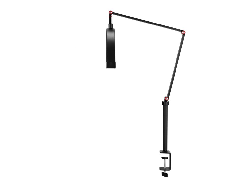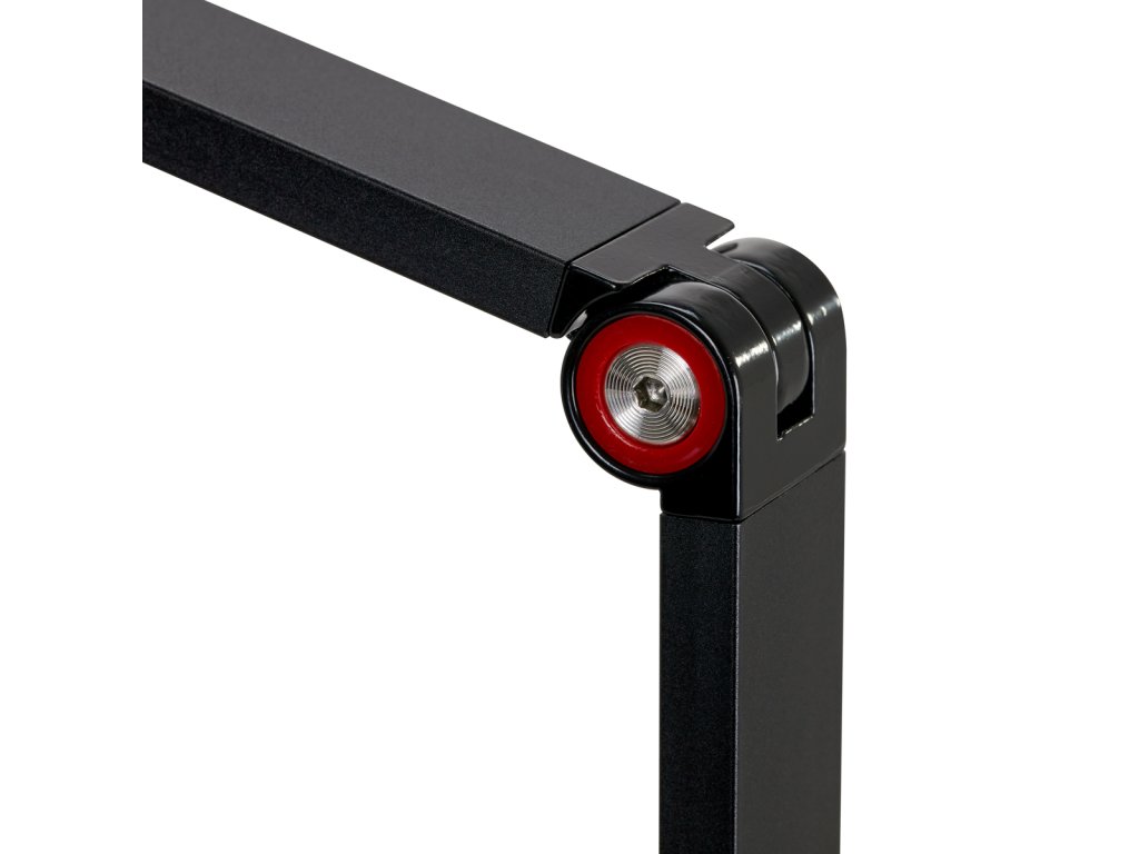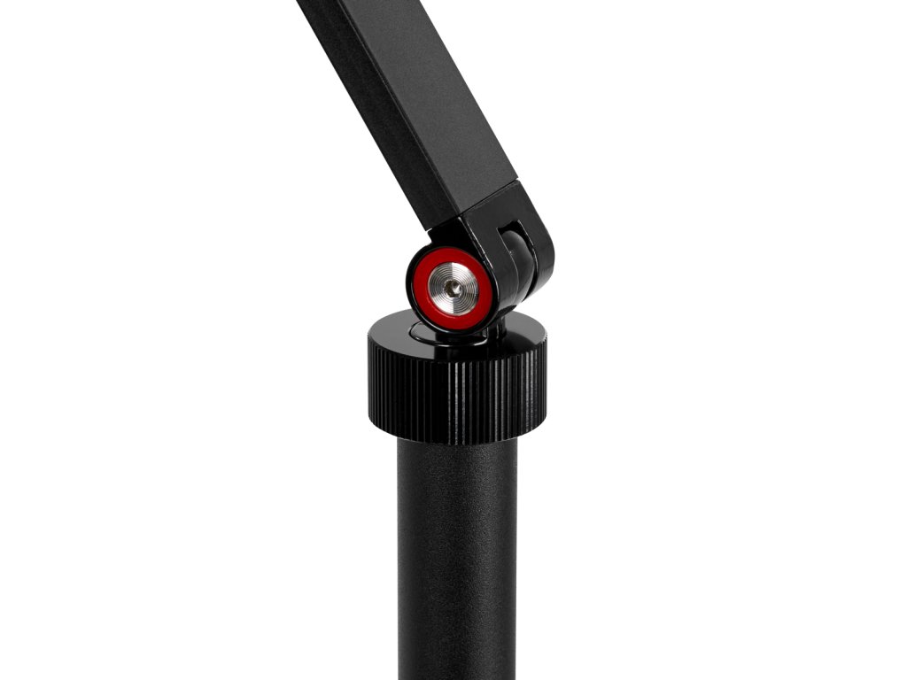 Jednoduchá forma statívu v klasickom čiernom odtieni, vďaka ktorému lampa vyzerá skvele takmer v každom interiéri.Matný povrch a červené prvky na spojoch mu dodávajú elegantný vzhľad. Možnosť voľnej montáže na dosku stolas rukoväťou fungujúcou na princípe zveráka, ktorého maximálny otvor je 6 cm - je vhodný pre väčšinu stolových dosiek.