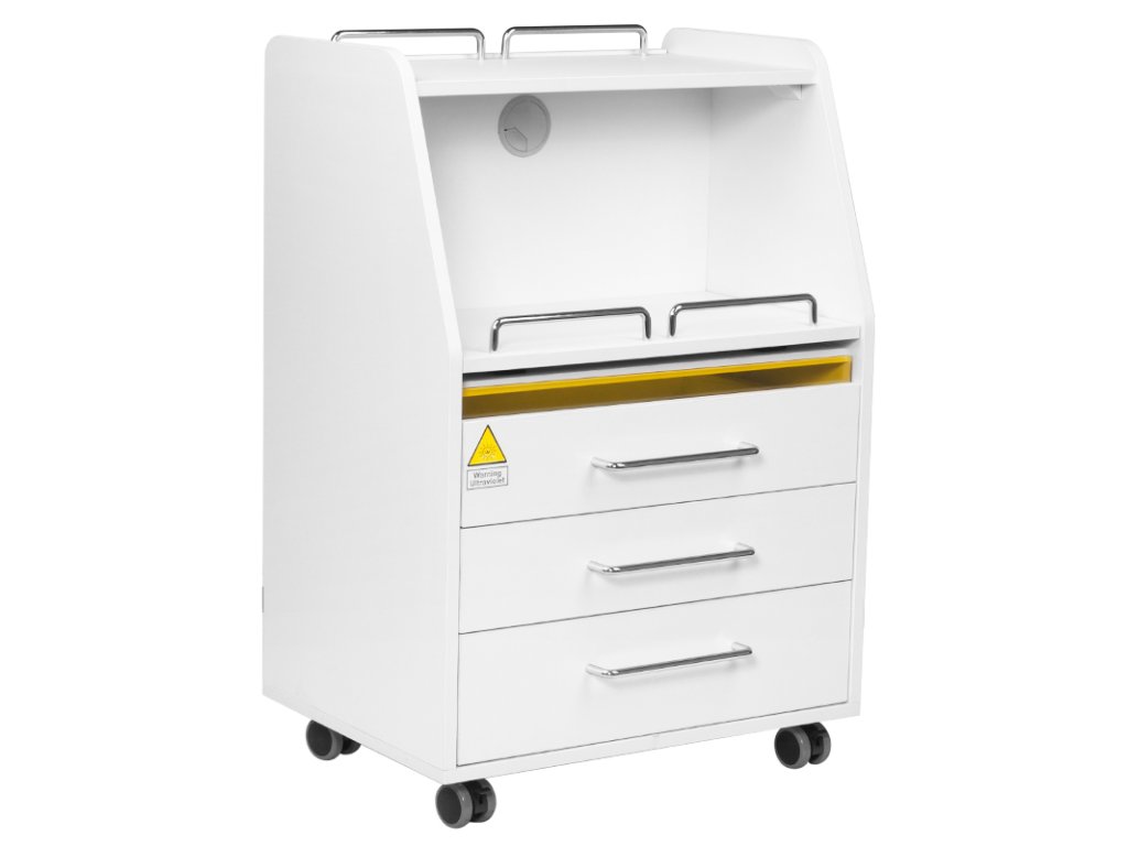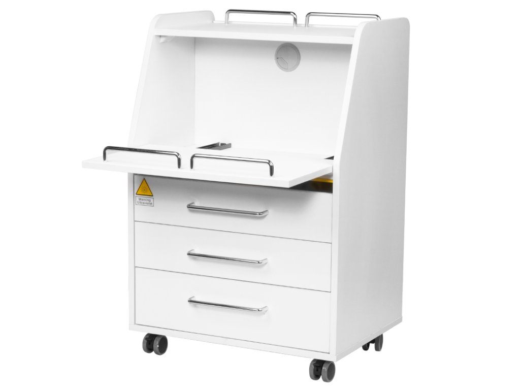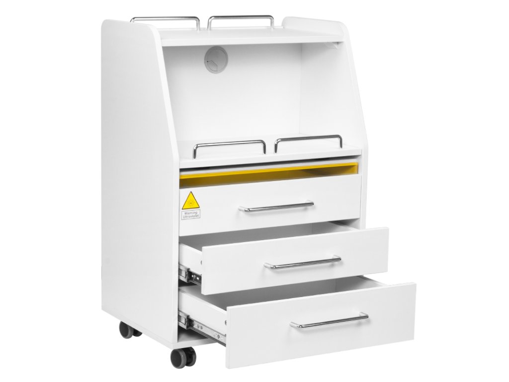 vysokokvalitný podiatrický pomocník je funkčný kozmetický kus nábytku na kolieskach. vďaka svojej mobilite ho môžete prepravovať do iných ošetrovacích miestností. pomocník má zásuvky na nástroje, príslušenstvo a posuvnú policu na podiatrickú frézu alebo iný prístroj. jedna zásuvka má zabudovanú uv-c lampu pre lepšiu sterilitu nástrojov a príslušenstva.