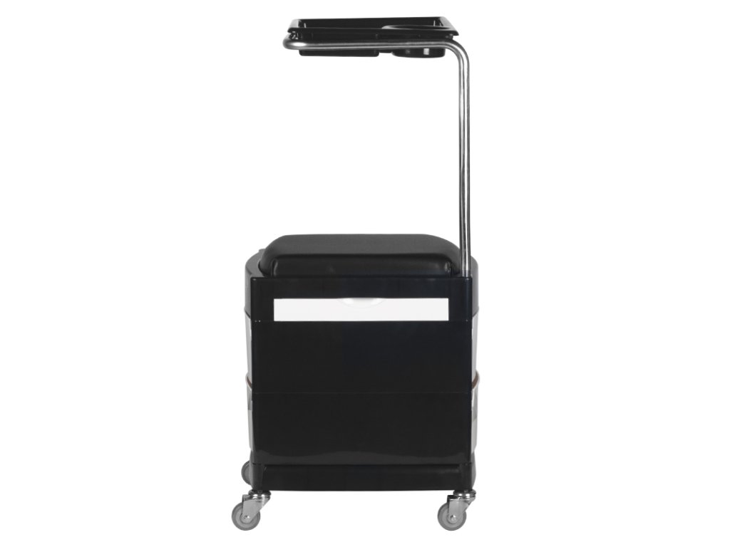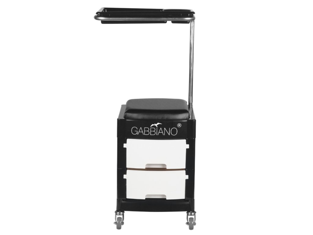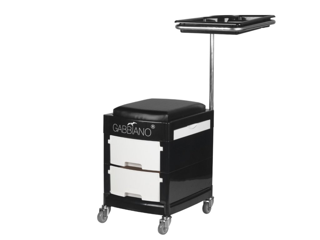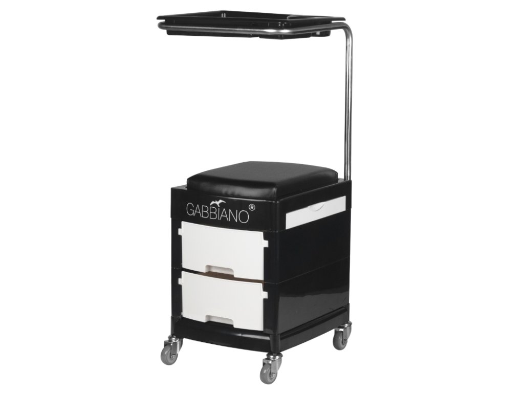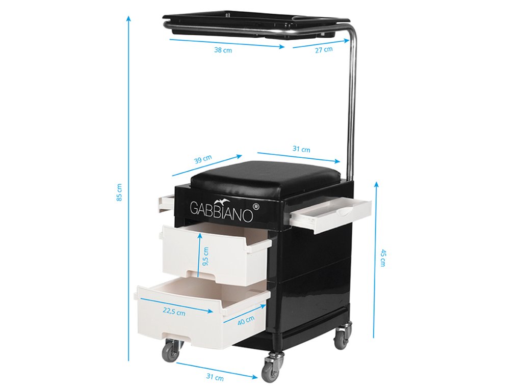funkčný kozmetický pomocník na vybavenie a náradie. nenahraditeľný pri každodennej práci, vďaka kolieskam a sedadlu ho možno použiť ako stoličku. pomocník sa ľahko prenáša, má 2 výsuvné police a dvierka so zásuvkou.