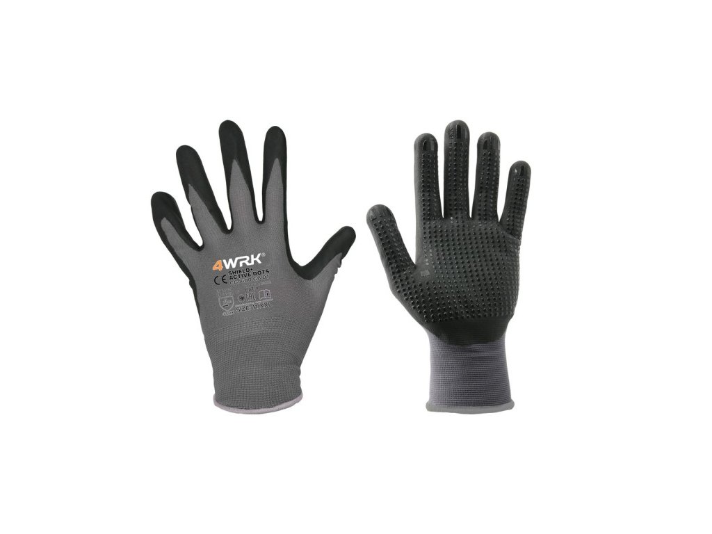 Pracovné rukavice Shield + Active Dots sú vyrobené z odolnej zmesi nylonu a spandexu. Táto tkanina poskytuje flexibilitu a priliehavé priliehanie bez toho, aby zvierala ruku. Nitrilový mikropenový povlak, obohatený PVC bodkami, zaručuje vynikajúci úchop a zvýšenú odolnosť proti oderu a roztrhnutiu. Vďaka tomu sú rukavice ideálne pre náročné práce vyžadujúce robustnú ochranu rúk.
