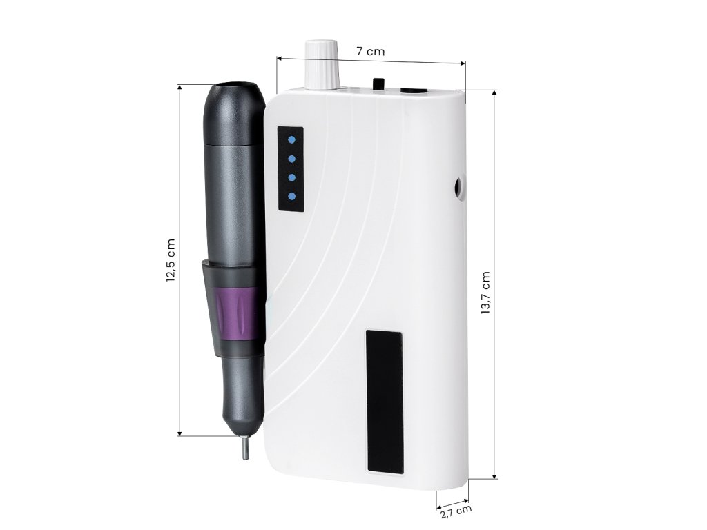 Vŕtačka na nechty je malá a jejminimalistické plastové puzdrov bielych odtieňoch uľahčuje udržiavanie zariadenia v čistote. Vďaka jehokompaktné rozmery a nízka hmotnosť, zariadenie sa ľahko skladuje v malých priestoroch a pohodlne prepravuje, čo je dôležité najmä pre ľudí, ktorí poskytujú mobilné služby. Na zadnej strane puzdra sa nachádza klip, ktorý umožňuje na pohodlné pripevnenie zariadeniana opasok alebo iné miesto.