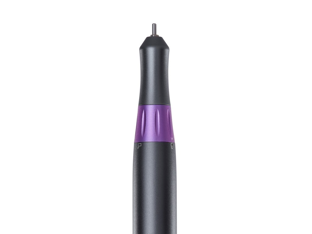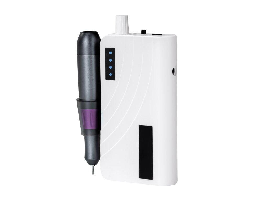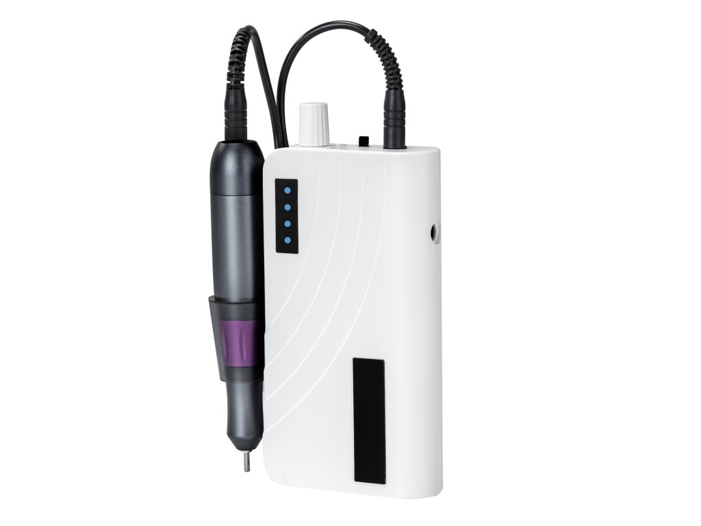 Tento gombík umožňujenastavenie rýchlosti hlavy až do 35 000 otáčok za minútu podľa individuálnych potrieb a liečby.Inovatívny systém kliknutia minimalizuje riziko zlyhania vŕtačky v dôsledku nedokonalého otočenia potenciometra. s výrazné kliknutie po otočení ovládača je používateľ informovaný o správnom nastavení, čo je jednoduchý, aleúčinná ochrana proti preťaženiu hlavového motora. Umožňuje pohodlný výkon rôznych služieb.Smer otáčania sa dá ľahko zmeniťpomocou špeciálneho prepínača aIndikátory LED poskytujú informácie o stave batérie.