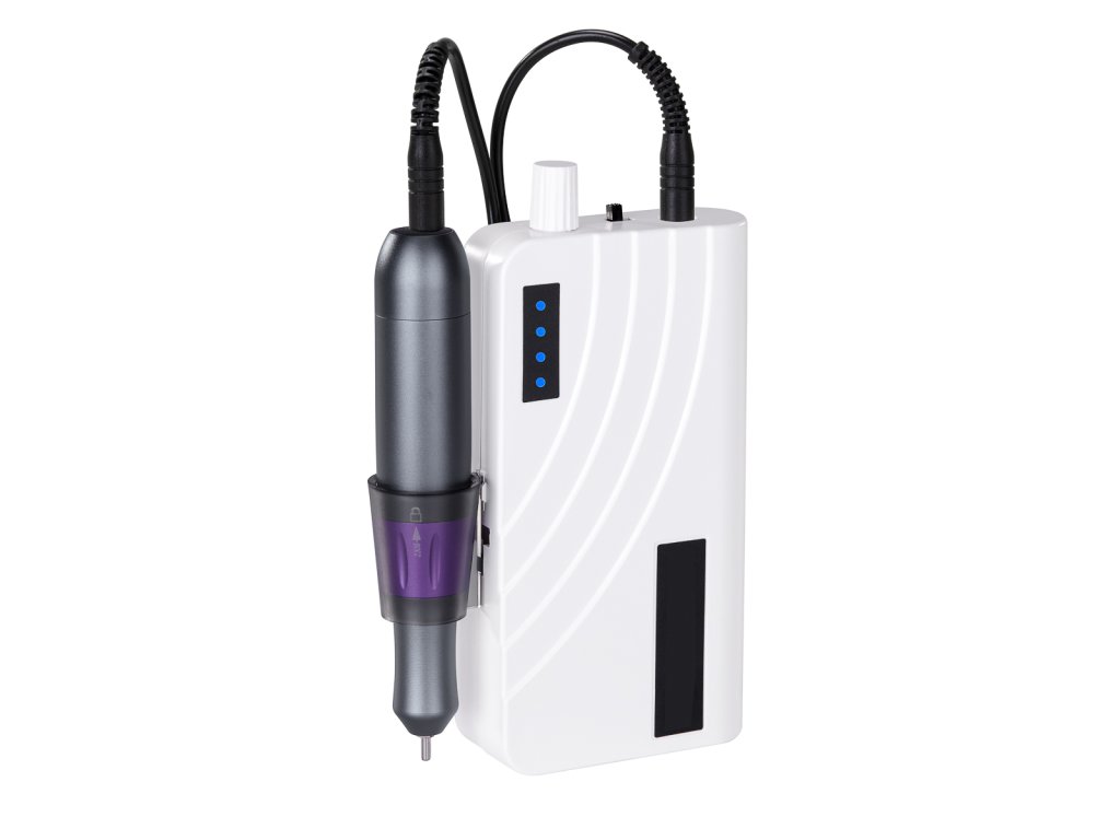 Účinná dobíjacia batéria s kapacitou 2 000 mAh s dvojitým zaostrovaním, ktorým je zariadenie vybavené, umožňujena nepretržitú prevádzku až 8-10 hodín na jedno nabitie. Vŕtačka na klince pracuje relatívne ticho, čo umožňujepohodlná práca bez dráždivých zvukov. Je to dôležité pre osobu vykonávajúcu ošetrenie aj pre pohodlie klientov. Počas práce možno hlavicu bezpečne zavesiť vďakapohodlná plastová rukoväťktoré možno namontovať na bočnú stranu zariadenia. Súprava obsahujesada diamantových vrtákov na klince, nosič a brúsne pásy, čo zaručuje všestranné použitie a uľahčuje vykonávanie rôznych ošetrení.