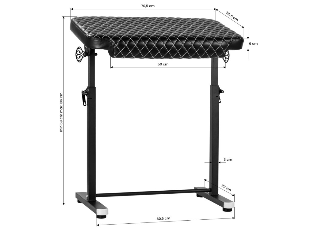 Výška podrúčky je nastaviteľná v rozmedzí 69-106 cm, čo umožňuje prispôsobiť ho rôznym klientom a zaručuje optimálna podpora počas tetovania. Vďaka funkcii nastavenia sklonu môžete polohu opierky prispôsobiť individuálnym potrebám klienta a vlastnostiam procedúry,poskytuje ešte väčší komfort počas tetovania.
