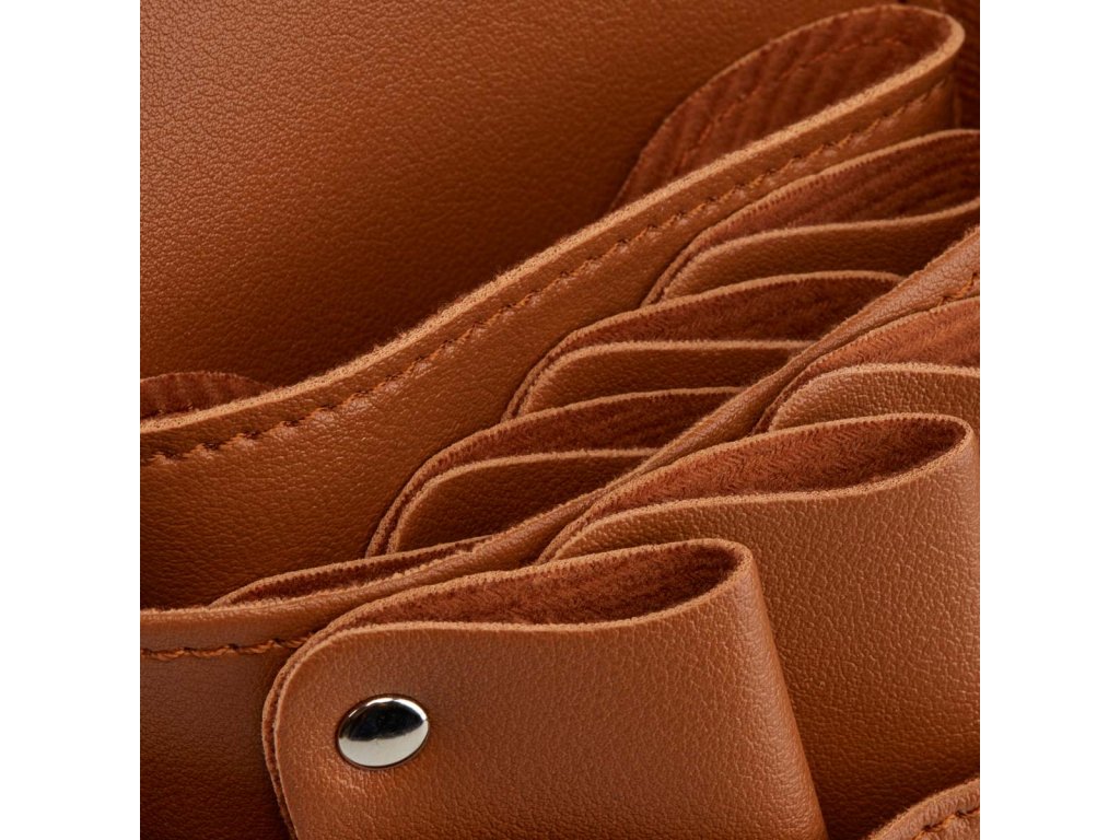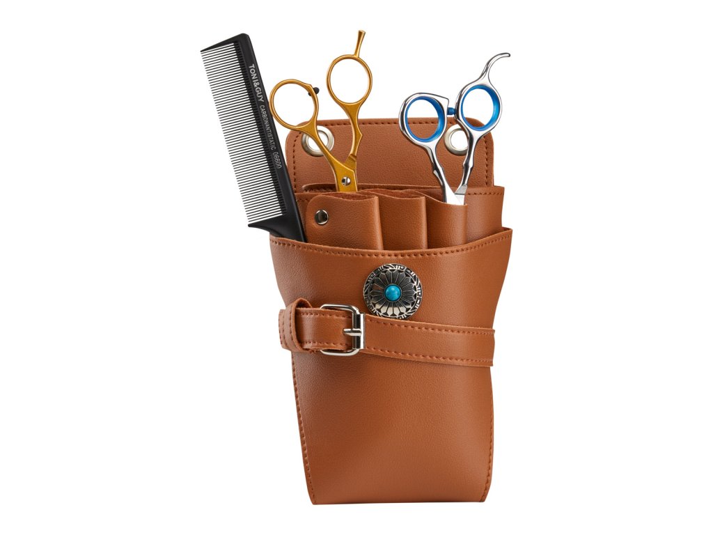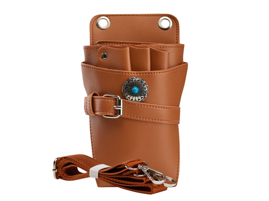 Puzdro je vyrobené z ekologickej kože a má hnedú farbu. Má krásny štítok, ktorý obsahuje drahý kameň. Ideálne na odkladanie kaderníckych nástrojov pri práci. Jeho používanie vám výrazne uľahčí prácu, pretože budete mať každý nástroj po ruke.