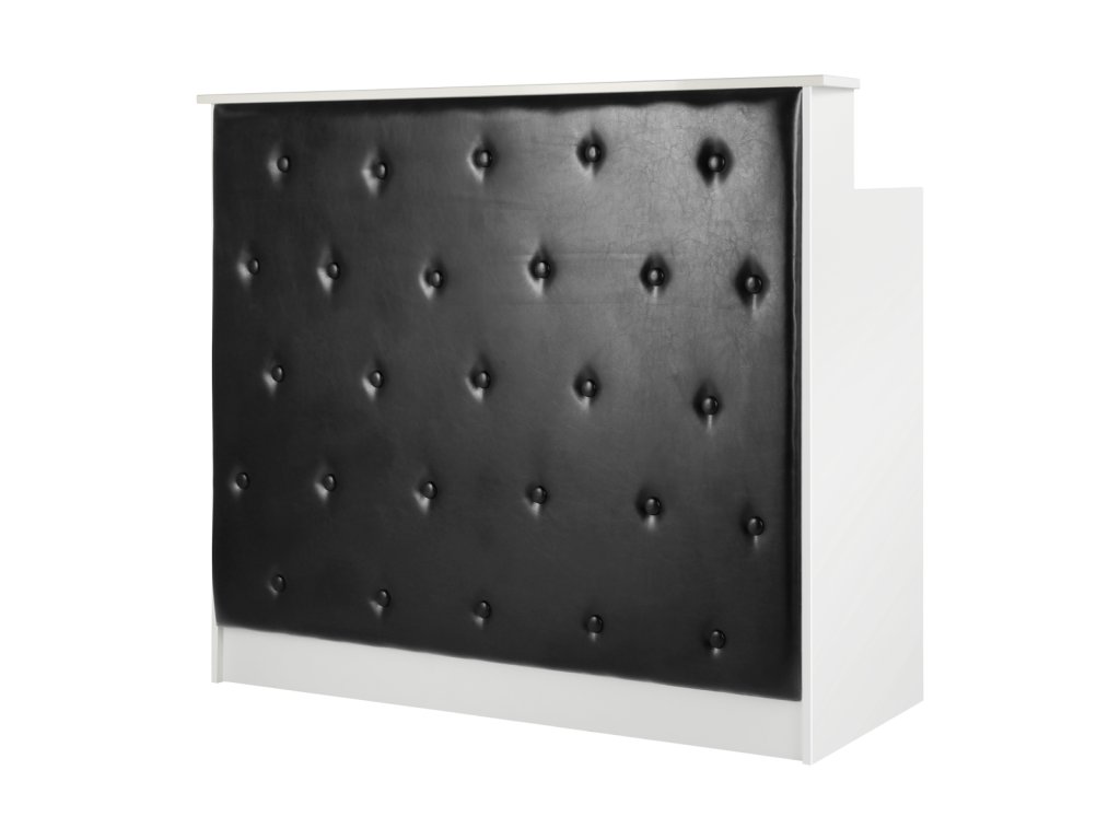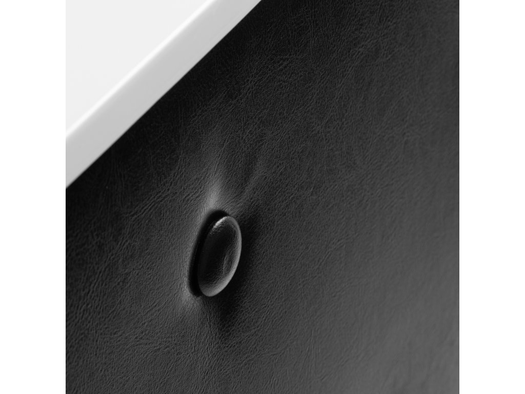 Tento kus nábytku je vyrobený z vysokokvalitnej, odolnej laminovanej dosky v odtieňoch bielej farby a jeho hladký povrchsa ľahko udržiavajú v čistote - v prípade znečistenia ich stačí utrieť vlhkou handričkou.Dekoratívna predná časť bola čalúnená syntetickou kožou v odtieňoch čiernej farby, ktorá jej dodávaštýlový vzhľad, zaručuje odolnosť a jednoduché čistenie.Ozdobné gombíky ďalej dodávajú eleganciu a jedinečnosť, čím sa zdôrazňuje charakter interiéru. Recepcia bolaje starostlivo vyrobený, je stabilnýa použité materiály umožňujú dlhoročné efektívne používanie.