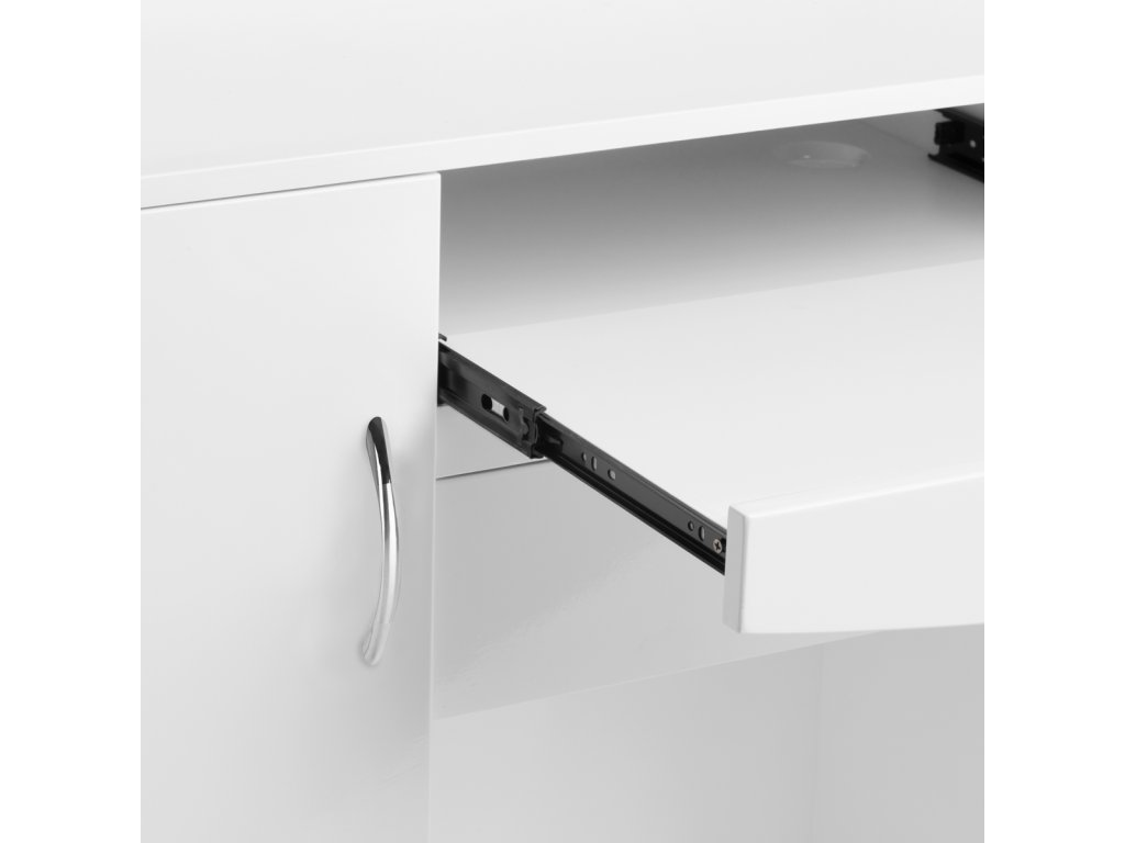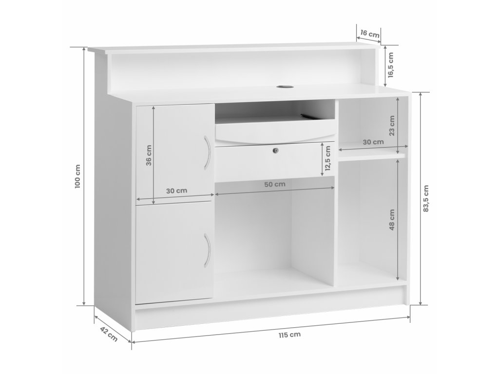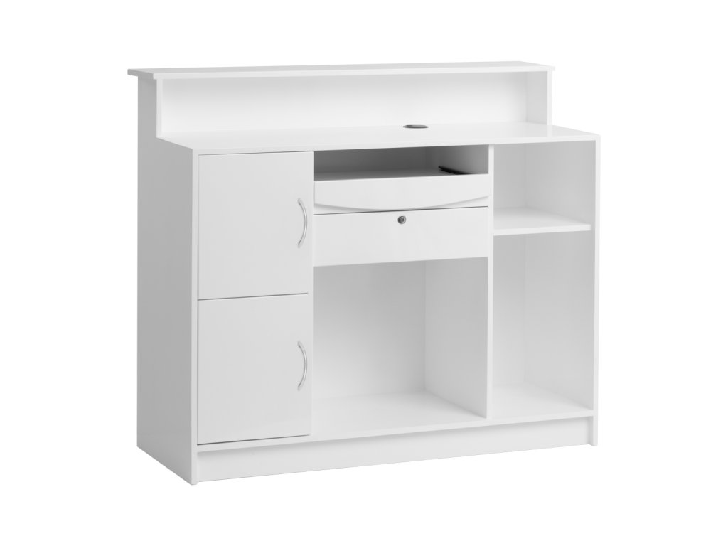 V praktickom pulte - ktorý vytváraideálny priestor na základné veci, ako je telefón, kancelárske príslušenstvo alebo kalendár - je tu vyhradený otvor na káble, ktorý umožňuje jednoduché pripojenie počítača a ďalšieho potrebného vybavenia.Premyslené riešenia a vhodné usporiadanie políc poskytujú skvelé príležitosti na prispôsobenie recepcie.