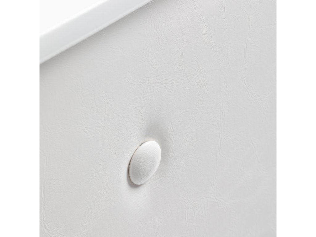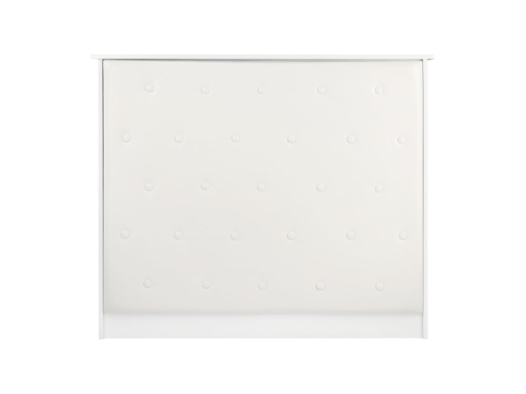 Tento kus nábytku je vyrobený z vysokokvalitnej, odolnej laminovanej dosky v odtieňoch bielej farby a jeho hladký povrchsa ľahko udržiavajú v čistote - v prípade znečistenia ich stačí utrieť vlhkou handričkou.Dekoratívna predná časť bola čalúnená syntetickou kožou v bielych odtieňoch, čo jej dodávaštýlový vzhľad, zaručuje odolnosť a jednoduché čistenie.Ozdobné gombíky ďalej dodávajú eleganciu a jedinečnosť, čím sa zdôrazňuje charakter interiéru. Recepcia bolaje starostlivo vyrobený, je stabilnýa použité materiály umožňujú dlhoročné efektívne používanie.