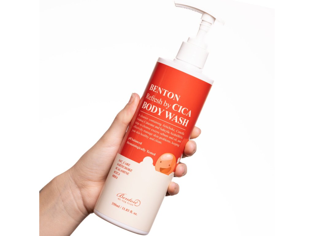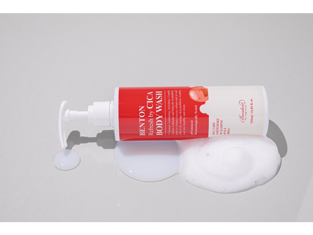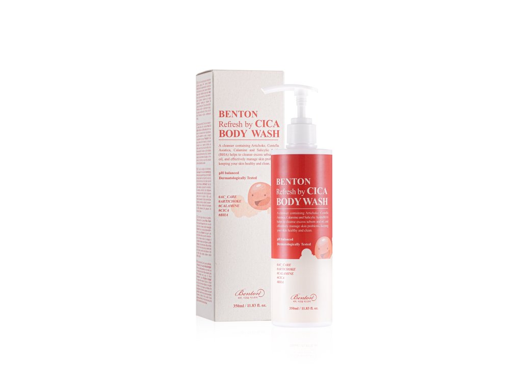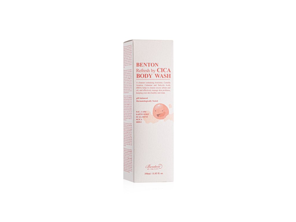 Tento nekomedogénny telový prípravok čistí pokožku a zároveň ju hydratuje a chráni.Vďaka nízkemu pH ho možno v prípade potreby použiť aj na tvár.Jeho zloženie je obohatené o výťažok z listov artičoku, centelly asiatskej a BHA - zložky, ktoré sú známe svojimi hydratačnými, exfoliačnými a upokojujúcimi vlastnosťami - a účinne čistí, vyživuje a chráni pokožku tela.Telový prípravok Refresh by Cica od kórejskej značky Benton má chladivú vôňu a veľmi príjemnú textúru. Nezanecháva na pokožke pocit pnutia, vďaka čomu je ideálnou voľbou pre všetkých, ktorí majú aknóznu alebo mastnú pokožku, pretože pomáha exfoliovať pokožku a liečiť akné na tele.???*Použitie*Používajte tento telový čistiaci gél pre čistú, chránenú a zdravú pokožku.??? ???*Zloženie*Aqua (voda), sodium myristoyl sarcosinate, disodium cocoamphodiacetate, Centella Asiatica Leaf Water, Acrylates Copolymer, Lauryl Betaine, Glycerin, 1,2-Hexanediol, Sodium Chloride, Dipropylene Glycol, Butylene Glycol, Kyselina salicylová, extrakt z Houttuynia Cordata, extrakt z listov artičoky (Cynara Scolymus), betaín, pantenol, trehalóza, metylpropándiol, kopolymér styrénu a akrylátov, hydrogenovaný lecitín, extrakt z ovsených jadier (Avena Sativa), Camellia Sinensis Leaf Water, Dipotassium Glycyrrhizate, Beta-Glucan, Melaleuca Alternifolia (Tea Tree) Leaf Extract, Centella Asiatica Extract, Madecassoside, Asiaticoside, Madecassic Acid, Asiatic Acid, Ficus Carica (Fig) Fruit Extract, Cyanocobalamin, Calamine, Ceramide NP, Polyquaternium-51, Disodium EDTA, Hexylene Glycol, Tromethamine, Ethylhexylglycerin, Citric Acid, Tocopherol, Rosmarinus Officinalis (Rosemary) Leaf Oil??? ???*Ako používať* Na vopred navlhčenú pokožku naneste gél a vytvorte jemnú penu pomocou rúk, sprchového uteráka alebo špongie a jemne trite pokožku, kým sa nečistoty úplne neodstránia. Opláchnite veľkým množstvom vody, kým sa prípravok úplne neodstráni.?