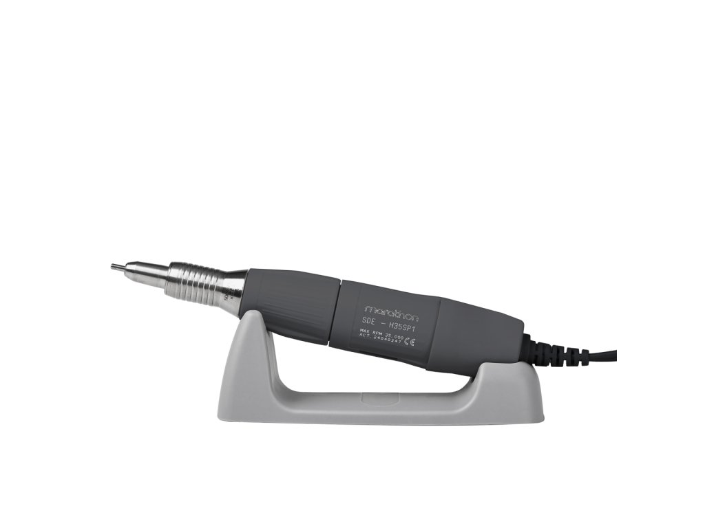Presný násadec H35LSP dokonale padne do ruky, čo zaručuje vysoký komfort používania. Dosiahnemaximálna rýchlosť 35 000 otáčok za minútu, čo ovplyvňuje efektivitu práce. Rukoväť je vybavenáľahko použiteľný systém Twist-Lock, čo uľahčuje rýchlu a plynulú výmenu vrtákov. Pero jesprávne vyvážené a ergonomicky profilovanéa okrem toho boli znížené vibrácie násadca, takže ani mnoho hodín práce s vŕtačkou na nechty nadmerne neunavuje ruku. Plastový krytobmedzuje prenos tepla aby nebolo viditeľné zahrievanie zariadenia. Pružný pružinový kábel poskytuje vysoký komfort pri práci,dosahuje dĺžku až 135 cm s výrazným rozťahovaním.