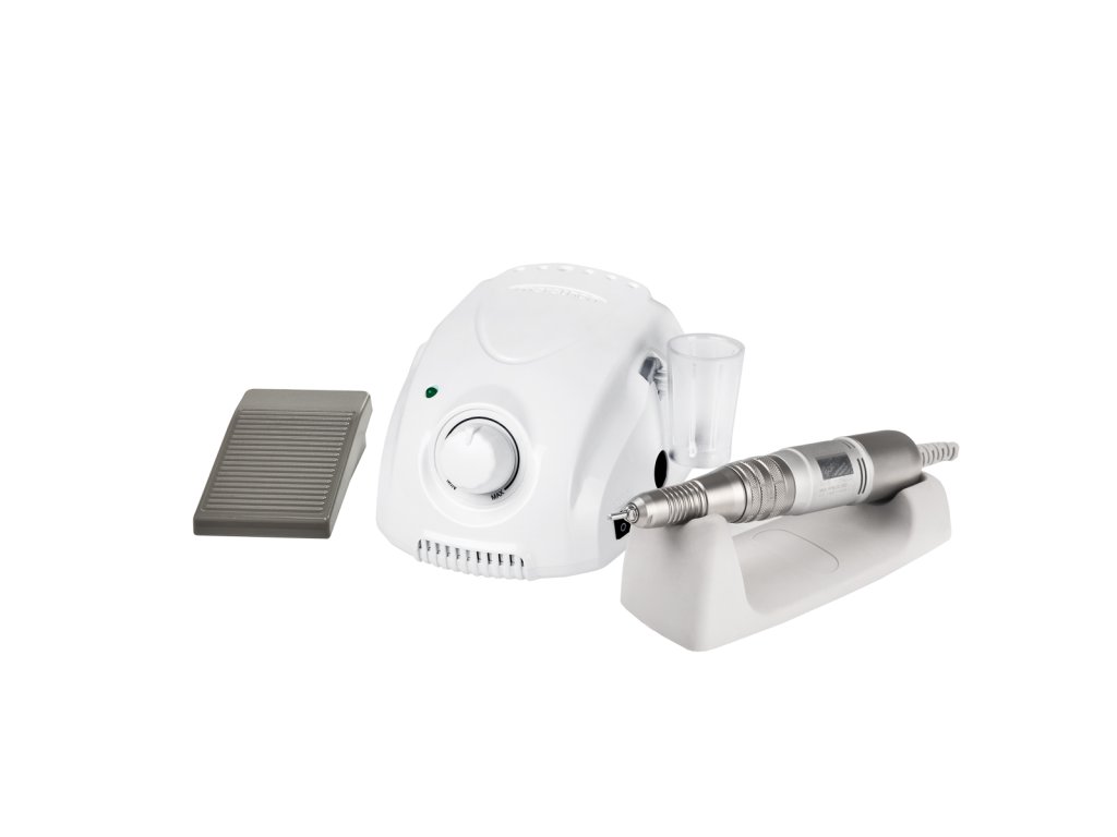 Zahrnuté: základňa na vŕtanie nechtov, rukoväť, napájací zdroj, nožný pohon, silikónový stojan na rukoväť, príručka.