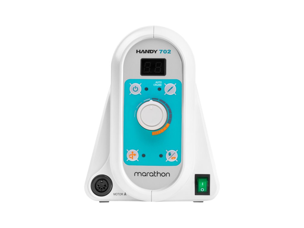 Vŕtačka na protetické nechtyMarathon Handy 702 ponúka vysoký výkon a tichú prevádzku. Práca s touto vŕtačkou na klince je mimoriadne pohodlná vďaka tomu, že v mikromotore hlavy bol použitý systém redukcie hluku, ktorý je v porovnaní s bežnými modelmi znížený o 20 %. Konštrukcia základne je ergonomická, má praktickú rukoväť na prenášanie a nádobu na hlavu.