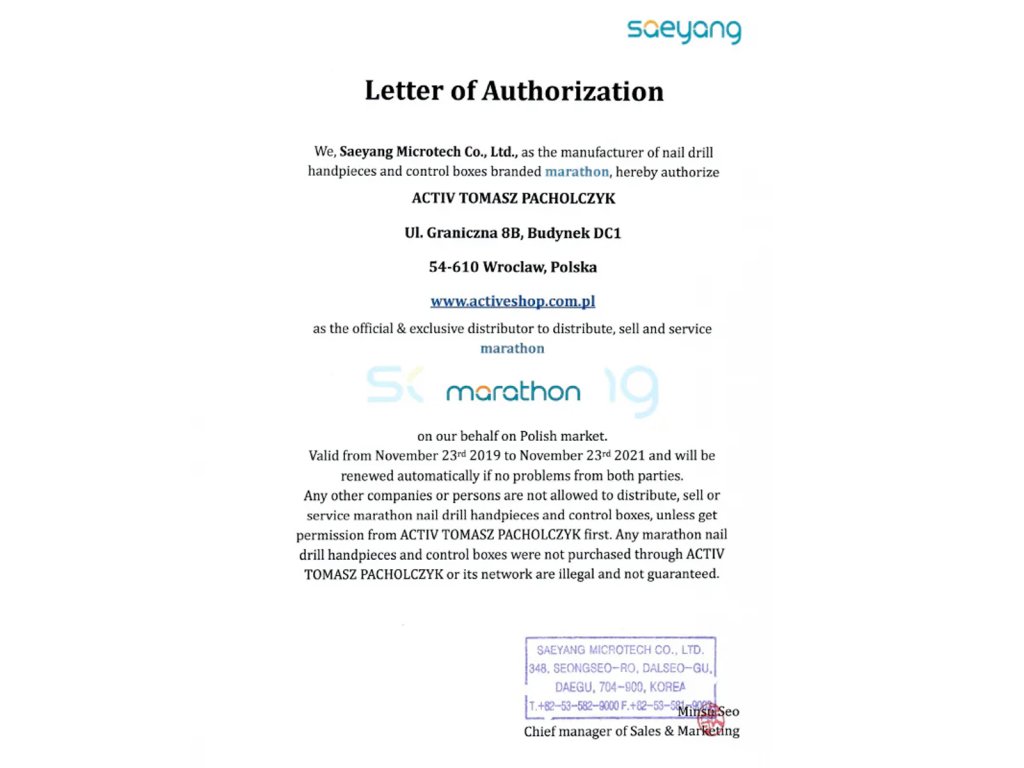 Vŕtačka na nechty Marathon N7 od kórejskej spoločnosti Saeyang je skvelým nástrojom na manikúru a pedikúru, ako aj na protetické práce. Spoločnosť získala viacero ocenení za výnimočné úspechy a jej výrobky odporúčajú kozmetici a protetici. Takmer päť desaťročí skúseností je zárukou získania výrobku najvyššej kvality.