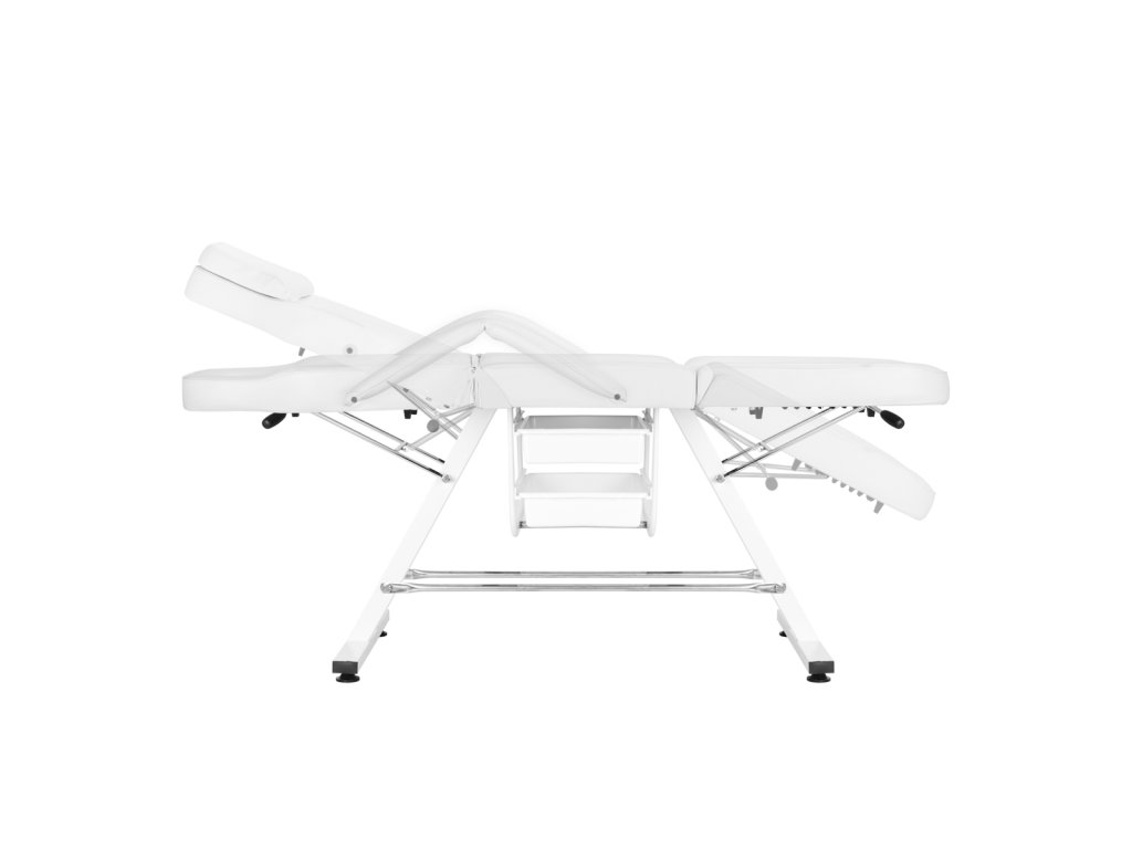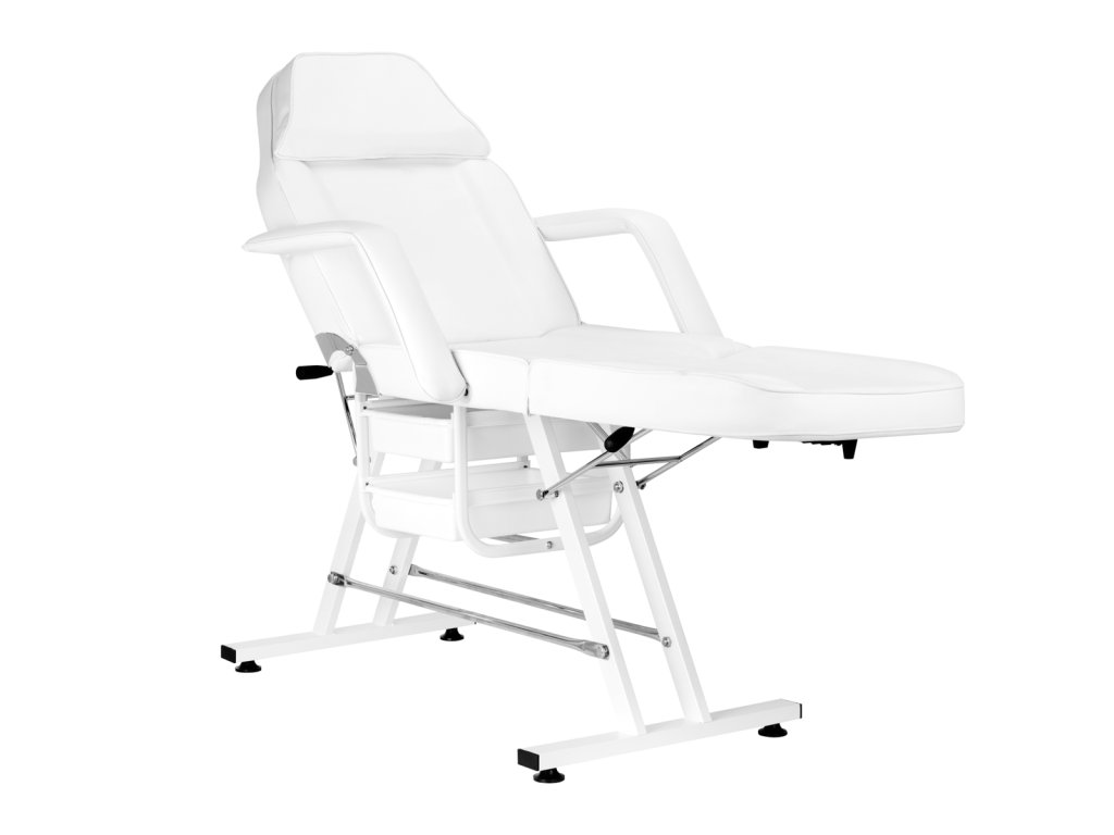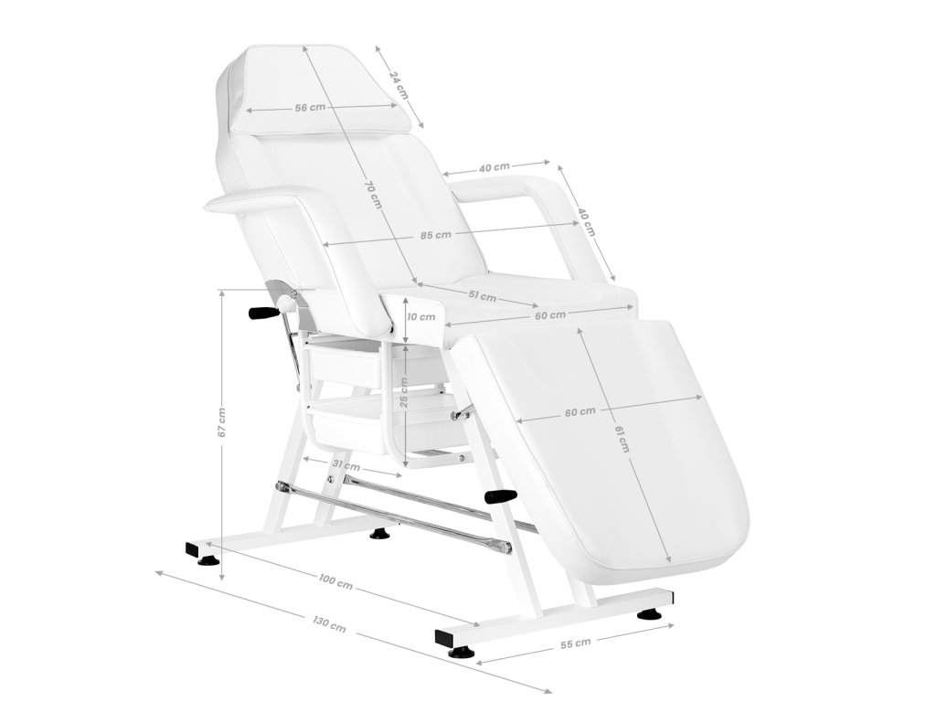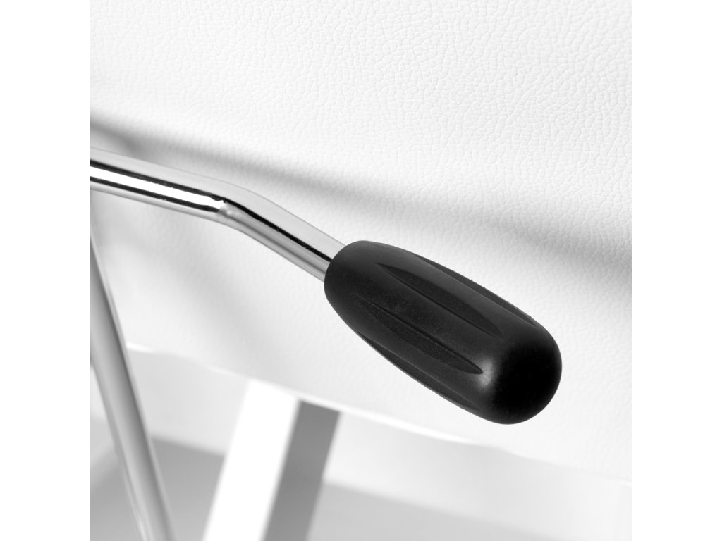 Gradual adjustment of the angles at which the footrest and backrest are located is provided by a special mechanism. Using a manual lever, you can smoothly adjust the positioning of the chair. This allows for optimal adjustment to individual needs, for proper and comfortable performance of treatments and high comfort of use. The chair can be unfolded up to the reclining position, which significantly increases its functionality. This allows you to freely perform various types of treatments in the field of among others cosmetics, physiotherapy or tattooing.