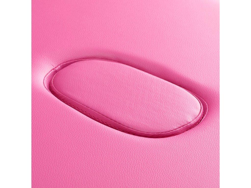 Praktický stôl je čalúnenýna dotyk príjemná imitácia kože v elektrizujúcom ružovom odtieni a výplň z odolnej peny s primeranou tvrdosťou zaručujepohodlie počas ošetrenia. Pri použití takýchto materiálov je výrobokpohodlné používanie, odolné, vodotesné a ľahko sa udržiavajú v čistote. Nohy sú vyrobené z hliníka v odtieňoch čiernej farby, ktorá sa vyznačuje vysoká odolnosť voči vlhkosti, takže stôl je vhodný aj na miesta s vysokou vlhkosťou, ako sú šatne alebo športové kluby.