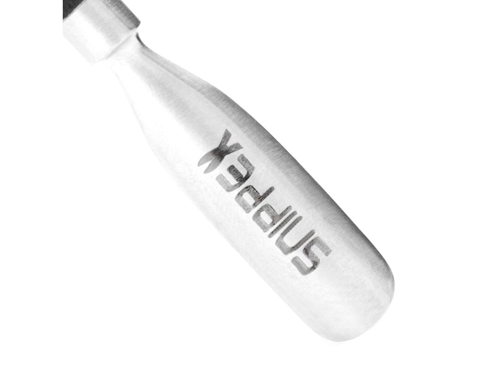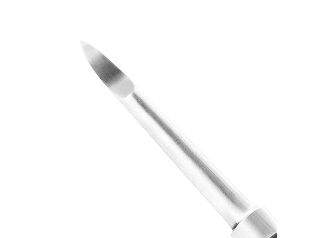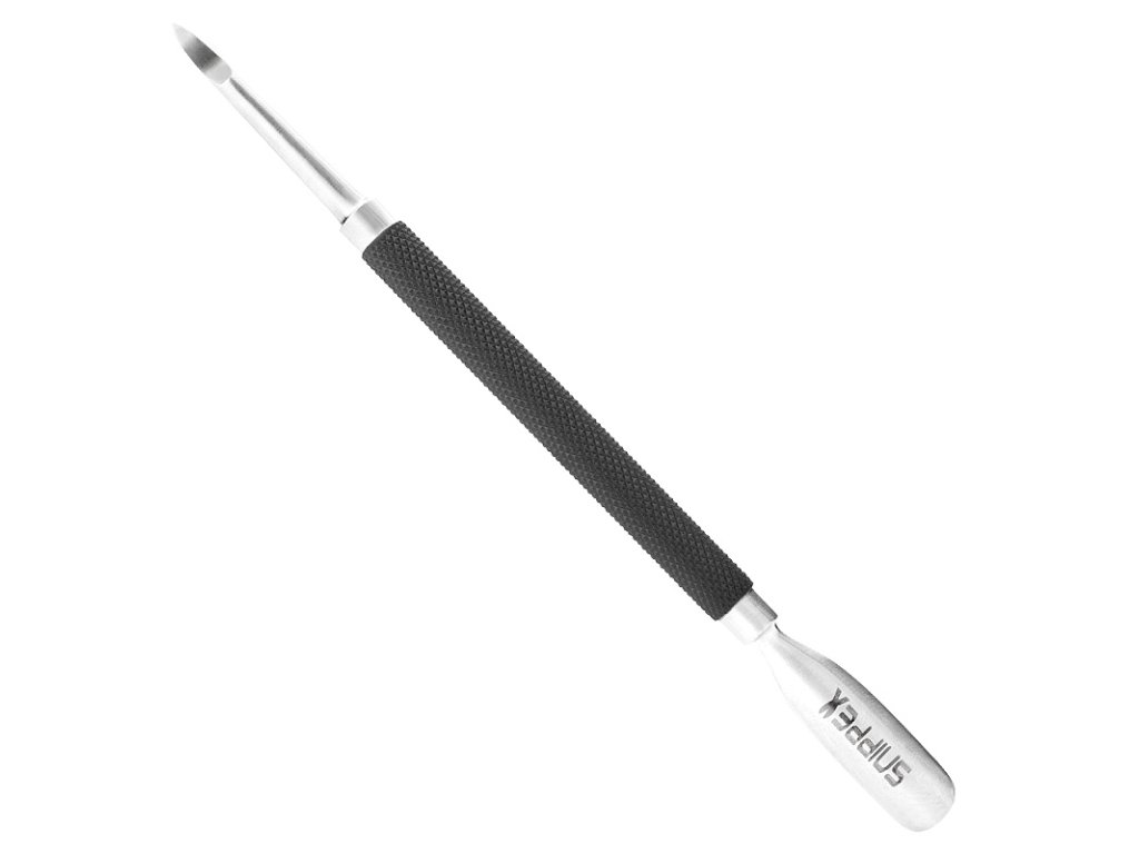 obojstranné manikúrové kopyto. jedna strana s polkruhovým koncom na zatláčanie kožičky, druhá strana s ostrým koncom na čistenie okraja nechtu. čierny, drážkovaný kolík uľahčuje prácu. vhodné na dezinfekciu.