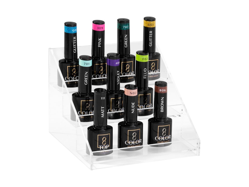 Zobrazenie laku nájde uplatnenie v profesionálnom kozmetickom salóne aj v domácnosti. Umožňuje prezentovať farby lakov v jednoduché a pôsobivé okrem toho ich môžete ľahko udržiavať v poriadku. Stránkapriehľadný materiál z ktorého je organizér vyrobený, uľahčuje vyhľadávanie konkrétnej farby a umožňuje rýchlu kontrolu stavu lakov.