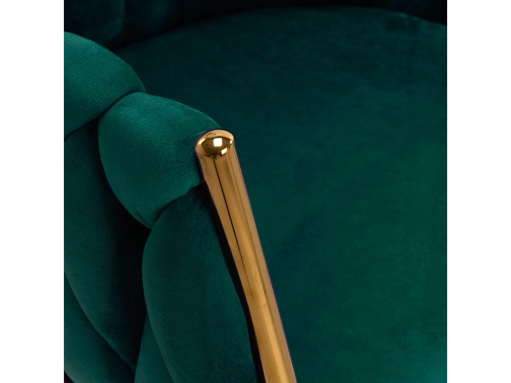 Na dotyk príjemný materiál, zamatové čalúnenie v zelených odtieňoch dodáva stoličke jedinečný charakter a esteticky prepletená látka na operadle zdôrazňujejedinečný vzhľad nábytku. To mu dodáva exkluzívny vzhľad a zabezpečuje pohodlie pri používaní. Rám v odtieňoch zlatej farby dodávaelegancia a prestíž, ktoré dokonale ladia so zamatom. Elegantná stolička 4Rico jevýnimočne pohodlný kus nábytku ktoré ozdobia recepciu každého kozmetického salónu.