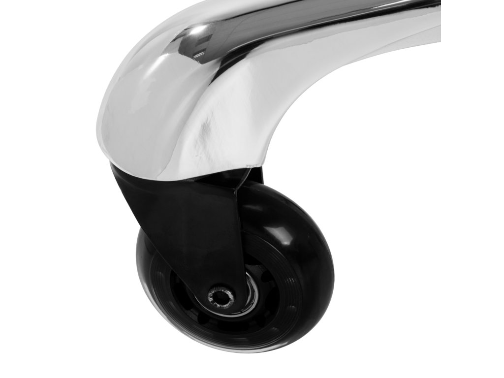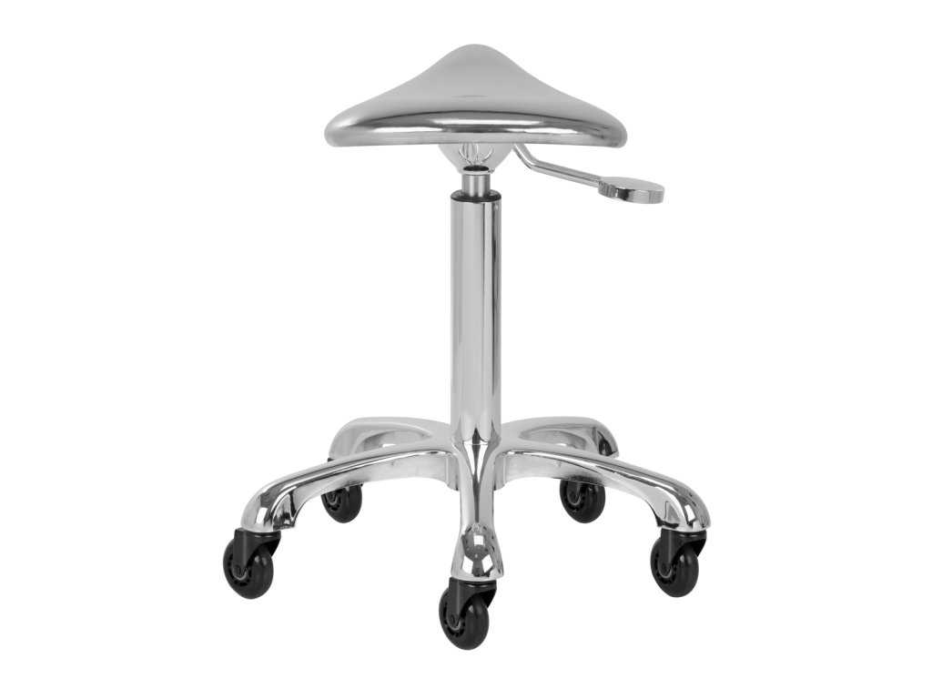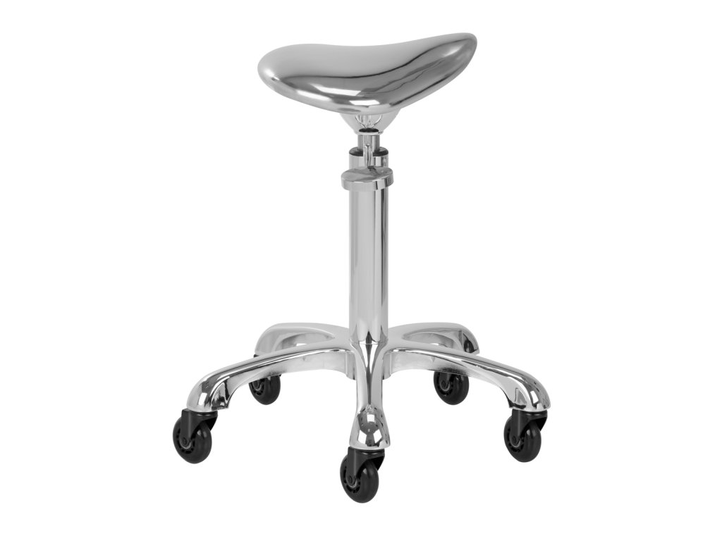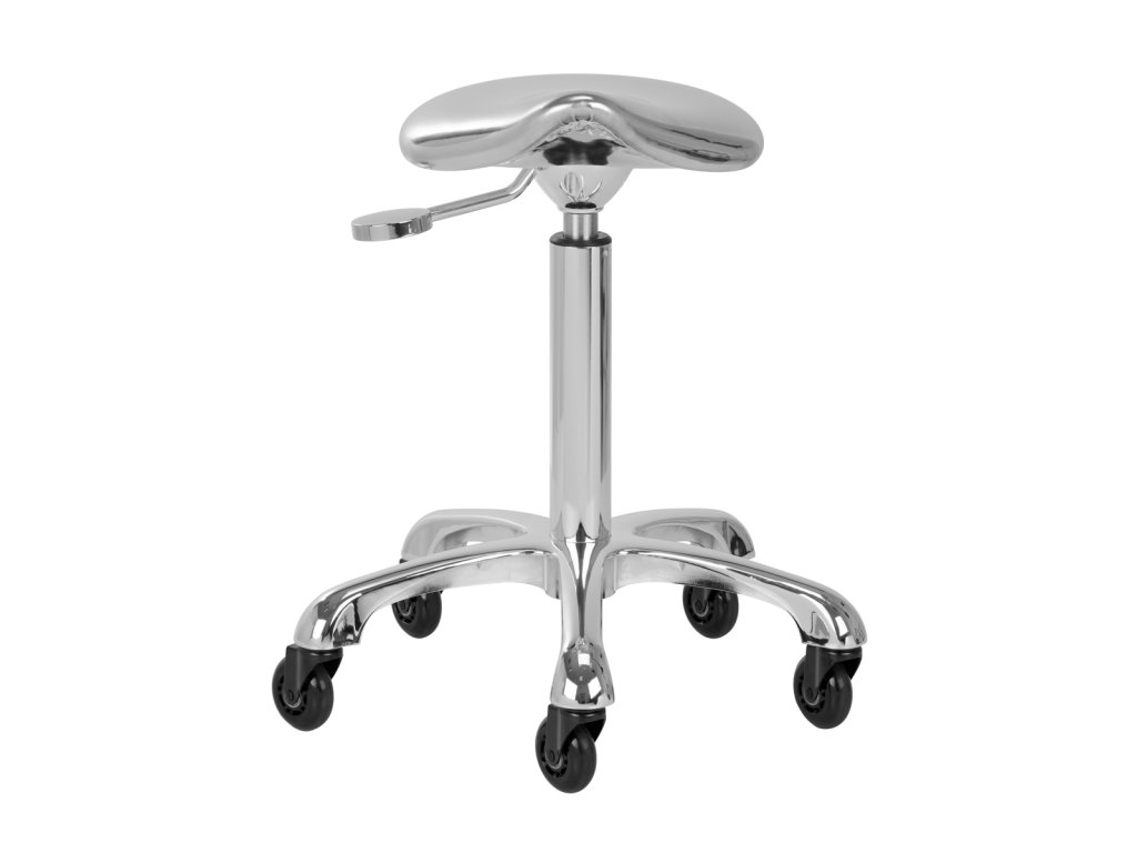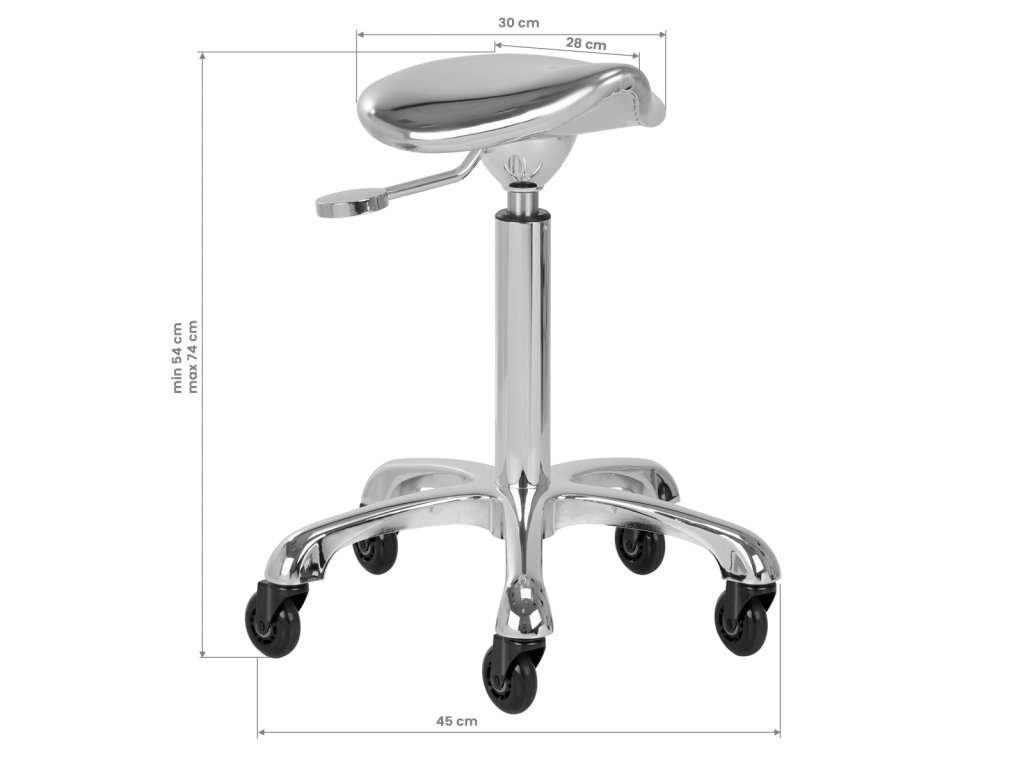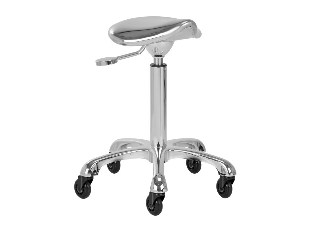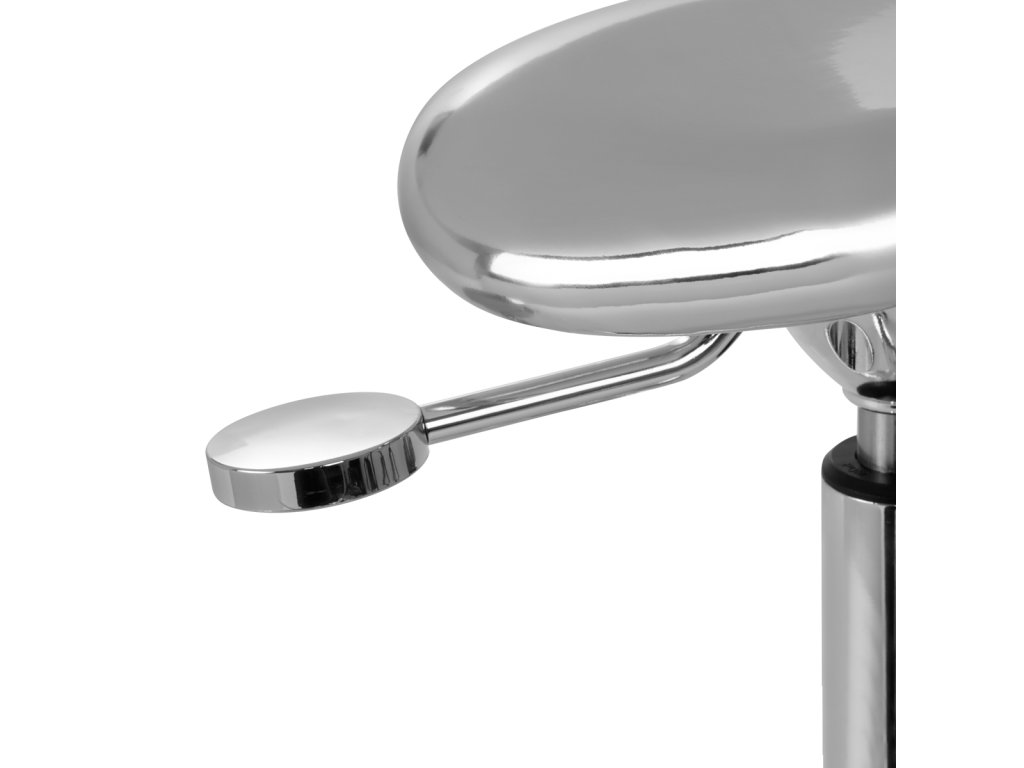 Jedinečný vzhľad stoličky je nezabudnuteľný, pôsobí mimoriadne elegantne a bude štýlovým prvkom každého interiéru. Výborne sa bude hodiť do kaderníckych aj kozmetických salónov. Chrómovaný rám a stabilná päťhviezdičková základňa s gumenými kolieskami zaručujú bezpečné používanie, značnú mobilitu a možnosť prispôsobiť sa vašim potrebám. Správne vyprofilované sedadlo v tvare sedla vyplnené nedeformovateľnou penou zaručuje používateľom pohodlie. Poťah z lesklej syntetickej kože v strieborných odtieňoch sa ľahko čistí, je odolný a odolný voči vlhkosti.