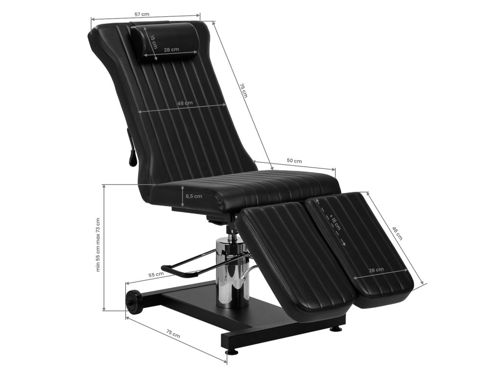 Používanieúčinný hydraulický pohon umožňuje plynulé nastavenie výšky stoličkyv rozsahu od 55 do 73 cm. Táto praktická funkcia umožňujeprispôsobiť nábytok individuálnym preferenciám používateľa a rôzne potreby súvisiace s charakteristikami tetovacieho priemyslu. Stolička tak poskytujeoptimálne podmienky na vykonávanie presných a zložitých umeleckých diel.