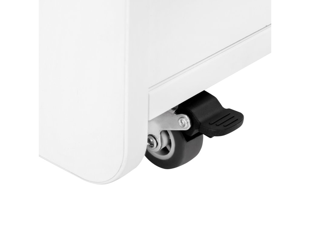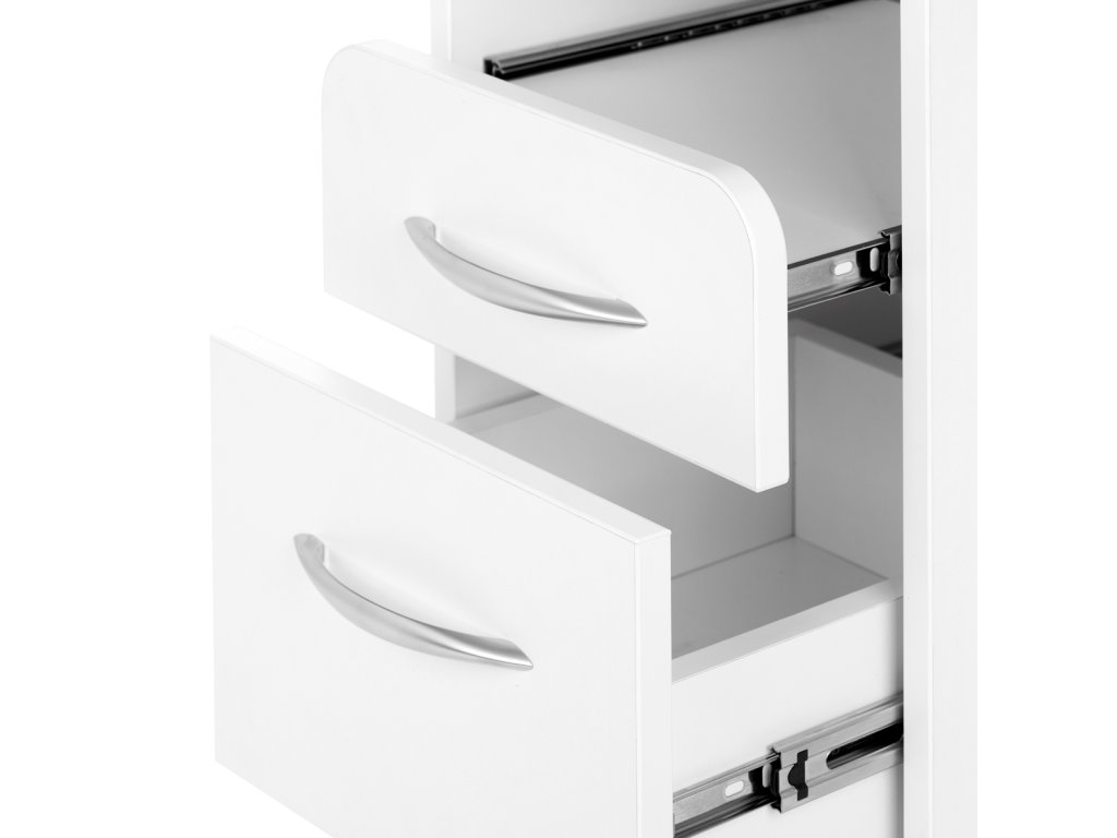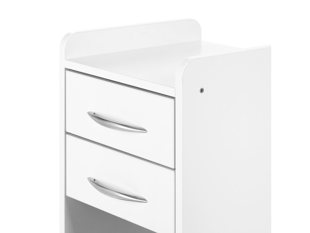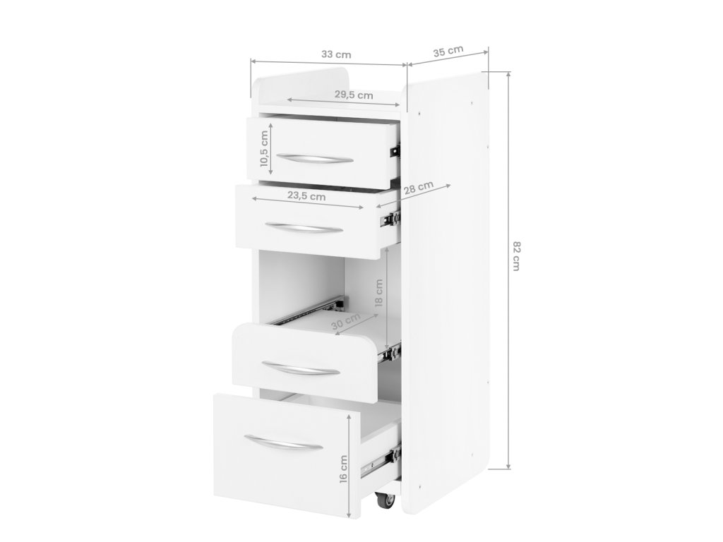 Úložná jednotka je vybavená4 zásuvky rôznych veľkostí, ktorý vám umožní usporiadať rôzne príslušenstvo, nástroje a kozmetické výrobky. Skrinka je vybavenás praktickými kolesami, čo uľahčuje premiestňovanie a umožňuje umiestniť nábytok kamkoľvek. Je navrhnutý s ohľadom na podiatrických profesionálov a mášpeciálne miesto pre podiatrickú vŕtačku na nechty s absorbérom Saeyang Marathon Cyclone-Vac, ktorý umožňuje pohodlné a ergonomické vykonávanie ošetrení.