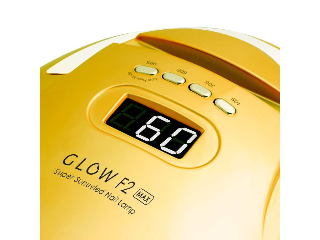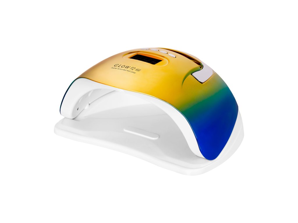 Je vybavený až57 správne usporiadaných LED diód (bez tzv. "mŕtvej zóny") scelkový výkon 220 W, čím sa zabezpečí dokonalé vytvrdnutie gélov a hybridných lakov. Model Glow F2 má uzavretý tvar,takzvaný stánok, ktorý umožňuje rovnomerné a presné vytvrdnutie nechtového stylingu.Technológia Dual Led použité v tomto zariadení spôsobujú, že diódy vyžarujú svetlo dvoch vlnových dĺžok,neunavuje oči a poskytuje široké spektrum prevádzky. Vďaka použitým riešeniam,lampa rýchlo a správne lieči aj tie najnáročnejšie produkty, ktoré sa dostanú aj na najnedostupnejšie miesta na nechtovej platničke.