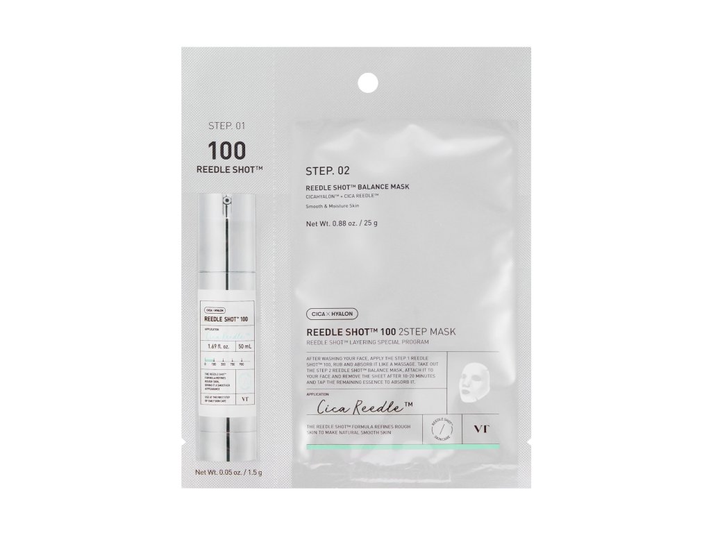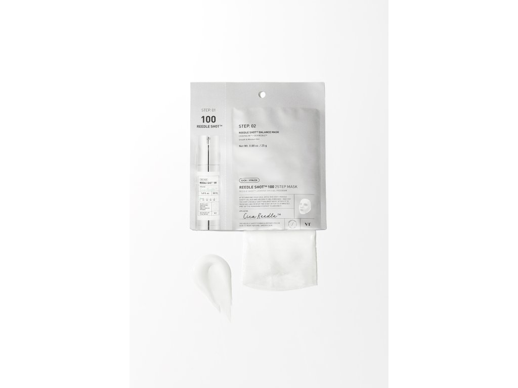 VT Reedle Shot 100 2-Step Mask je pokročilá dvojfázová maska určená na revitalizáciu pleti a viditeľné zlepšenie jej pružnosti už pri prvom použití. Tento systém kombinuje koncentrovanú esenciu obohatenú o mikroihličky na zvýšenie absorpcie aktívnych zložiek, po ktorej nasleduje listová maska napustená intenzívnym sérom. Technológia mikrojehličiek pripravuje pleť na optimálnu absorpciu a umožňuje kľúčovým zložkám, ako je kyselina hyalurónová, hydrolyzovaný kolagén a peptidy, preniknúť do hĺbky. Táto kombinácia prináša intenzívnu hydratáciu, zlepšuje pevnosť a poskytuje okamžitý liftingový efekt. Zloženie obsahuje aj výťažok z centella asiatica, ktorý je známy svojimi upokojujúcimi a regeneračnými vlastnosťami - ideálny na minimalizáciu podráždenia a posilnenie kožnej bariéry. Výsledkom je viditeľne hladšia, jasnejšia a revitalizovanejšia pleť. Toto ošetrenie sa odporúča najmä tým, ktorí doma hľadajú výsledky na profesionálnej úrovni a účinne riešia skoré známky starnutia a stratu pevnosti.???*Použitie*Použite túto dvojfázovú masku na revitalizáciu pleti a zvýšenie jej pružnosti.??? ???*Zloženie*[STEP.01] Aqua (voda), dipropylénglykol, glycerín, niacínamid, butylénglykol, olej zo semien Macadamia Ternifolia, 1,2-hexanediol, etylhexylpalmitát, kopolymér akrylátu sodného/akryloyldimetyltaurátu sodného, polyizobutén, oxid kremičitý, glyceret-26, kaprylový glykol, etylhexylglycerín, adenozín, polyakrylát sodný, hyaluronát sodný, Výťažok z Centella Asiatica, kaprylyl/kapryl glukozid, sorbitán oleát, xantánová guma, výťažok z propolisu, asiaticosid, kyselina ázijská, kyselina madekastová, madekastozid, glycín, Serín, kyselina glutámová, kyselina asparágová, leucín, alanín, lyzín, arginín, tyrozín, fenylalanín, prolín, treonín, valín, izoleucín, histidín, cysteín, metionín [STEP.02] Aqua (voda), butylénglykol, glycerín, niacínamid, izopentyldiol, betaín, dipropylénglykol, 1,2-hexanediol, hydroxyacetofenón, polyakrylát sodný, hydroxyetylakrylát/akryloyldimetyltaurátový kopolymér sodný, Kopolymér akryloyldimetyltaurátu amónneho/VP, olej z plodov Olea Europaea (olivy), alantoín, maslo Butyrospermum Parkii (bambucké maslo), triglycerid kaprylový/kaprový, hydrogenovaný lecitín, skvalán, etylhexylglycerín, Xantánová guma, adenozín, EDTA disodná, sorbitan izostearát, ceramid NP, cholesterol, extrakt z listov čajovníka (Melaleuca Alternifolia), fytosfingozín, extrakt z centella asiatica, kyselina olejová, hydrolyzovaný kolagén, Kyselina stearová, Asiaticoside, Brassica Campestris (Rapeseed) Sterols, Silica, Sodium Hyaluronate, Tocopherol, Asiatic Acid, Madecassic Acid, Madecassoside, Propolis ExtractTento zoznam zložiek sa môže líšiť. Viac informácií nájdete v zozname na obale alebo nám pošlite správu prostredníctvom chatu na našej webovej stránke.??? ???*Ako používať*Najprv naneste obsah Shot 100 na čistú pokožku a jemným stlačením aktivujte mikroihličky. Potom priložte na tvár fóliovú masku a nechajte pôsobiť 20-30 minút. Odstráňte masku a jemne vmasírujte zvyšné sérum, kým sa úplne nevstrebe.?