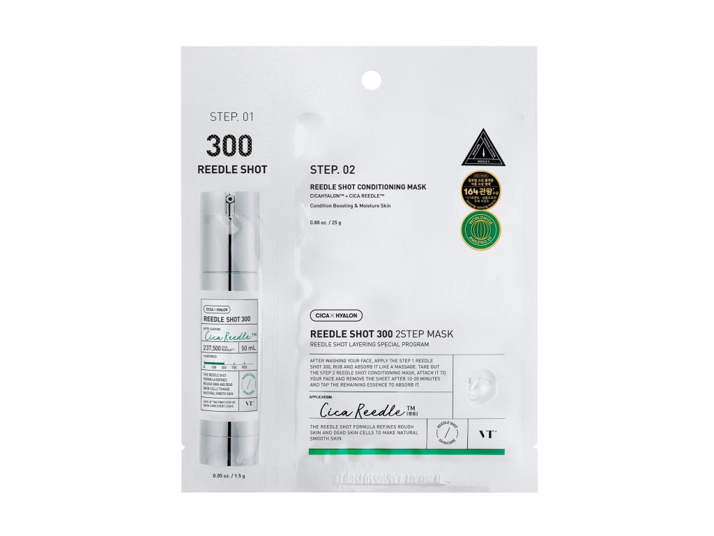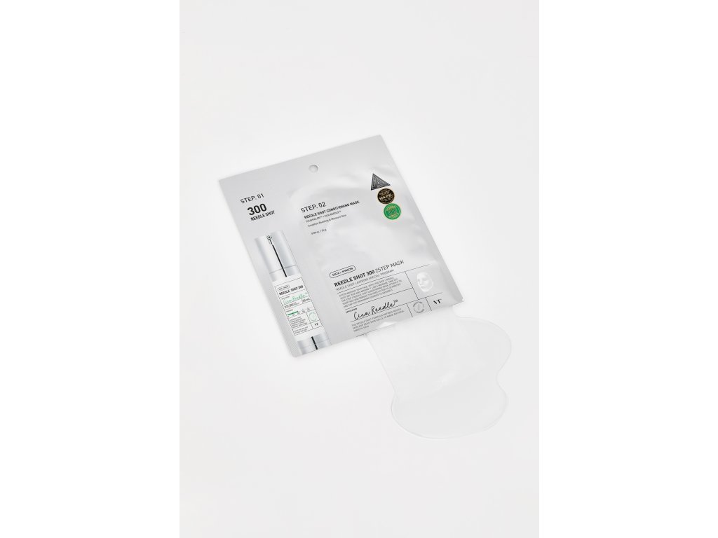 VT Reedle Shot 300 2-Step Mask je inovatívne ošetrenie, ktoré kombinuje pokročilú technológiu so silou prírodných zložiek na viditeľnú premenu pleti. Táto dvojfázová maska je vyvinutá tak, aby vyhladzovala, vyrovnávala a hĺbkovo hydratovala pleť - poskytuje výsledky na profesionálnej úrovni v domácom prostredí. Prvý krok obsahuje 237 500 mikroihličiek Cica Reedle™, exkluzívnu technológiu, ktorá zvyšuje absorpciu aktívnych zložiek a pomáha minimalizovať vzhľad pórov. Tieto prírodné mikroihličky jemne stimulujú pokožku a pripravujú ju na maximalizáciu účinkov nasledujúceho kroku. Pleťová maska je naplnená upokojujúcimi zložkami, ako sú centella asiatica, beta-glukán a panthenol, ktoré poskytujú intenzívnu hydratáciu, upokojujú citlivú pleť a viditeľne zlepšujú jej pružnosť. Štruktúra pleti sa zdá byť hladšia, začervenanie je redukované a pleť získava prirodzený jas. Táto maska je vhodná aj pre citlivú pleť a je ideálna pre tých, ktorí hľadajú ošetrenie, ktoré prináša viditeľné výsledky pri zachovaní komfortu a šetrnosti k pleti.???*Použitie*Použite túto dvojfázovú masku na revitalizáciu pleti a zlepšenie jej štruktúry.??? ???*Zloženie*[STEP.01] Aqua (voda), dipropylénglykol, glycerín, niacínamid, butylénglykol, olej zo semien Macadamia Ternifolia, 1,2-hexanediol, etylhexylpalmitát, oxid kremičitý, kopolymér akrylátu sodného/akryloyldimetyltaurátu sodného, polyizobutén, glyceret-26, kaprylylglykol, etylhexylglycerín, adenozín, polyakrylát sodný, výťažok z Centella Asiatica, Hyaluronát sodný, kaprylyl/kaprylglukozid, sorbitán oleát, xantánová guma, extrakt propolisu, asiatikozid, kyselina ázijská, kyselina madekazová, madekazozid, glycín, serín, Kyselina glutámová, kyselina asparágová, leucín, alanín, lyzín, arginín, tyrozín, fenylalanín, prolín, treonín, valín, izoleucín, histidín, cysteín, metionín [STEP.02] Aqua (voda), butylénglykol, glycerín, niacínamid, izopentyldiol, betaín, dipropylénglykol, 1,2-hexanediol, hydroxyacetofenón, hydroxyetyl-akrylát/akryloyldimetyl-taurát kopolymér sodíka, Kopolymér akryloyldimetyltaurátu amónneho/VP, olej z plodov Olea Europaea (olivy), maslo Butyrospermum Parkii (bambucké maslo), triglycerid kaprylový/kaprový, hydrogenovaný lecitín, skvalán, etylhexylglycerín, Xantánová guma, adenozín, polyakrylát sodný, EDTA disodná, sorbitan izostearát, ceramid NP, cholesterol, fytosfingozín, extrakt z Centella Asiatica, kyselina olejová, kyselina stearová, hydrolyzovaný kolagén, Oxid kremičitý, hyaluronát sodný, tokoferol, steroly Brassica Campestris (repka olejná), kyselina ázijská, ázijatikozid, kyselina madekastová, madekastozid, extrakt propolisuTento zoznam zložiek sa môže líšiť. Viac informácií nájdete v zozname na obale alebo nám pošlite správu prostredníctvom chatu na našej webovej stránke.??? ???*Ako používať*Najprv naneste obsah Shot 300 na čistú pokožku a jemným stlačením aktivujte mikroihličky. Potom priložte na tvár fóliovú masku a nechajte pôsobiť 20-30 minút. Masku odstráňte a zvyšné sérum vmasírujte, kým sa úplne nevstrebe.?