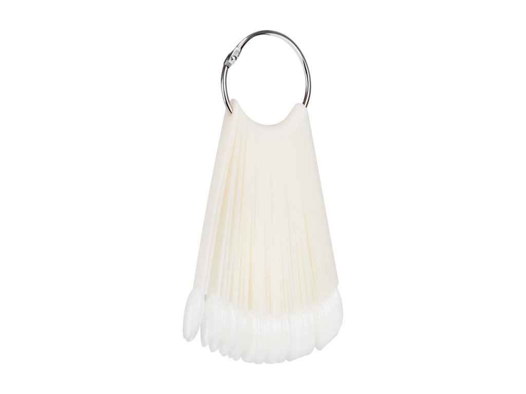 Šablóna na nechty vmliečnej farby umožňuje esteticky prezentovať všetky farby klasických a hybridných lakov alebo gélov. Skladá sa z50 jednotlivých hrotov oválneho tvaru a veľkosť zodpovedajú skutočným klincom. Je upevnený pomocou praktického odnímateľného kolieska, ktoréuľahčuje skladovanie celú vec. Každý hrot je vyrobený z odolného plastu.