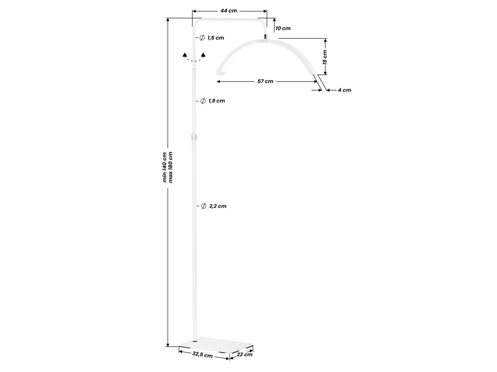 Stojan je ľahko nastaviteľný v rozmedzí 140-180 cm s aretačnou skrutkou umiestnenou na ramene. To umožňuje nastaviť polohu hlavy tak, abyvyhovieť individuálnym potrebám a rôzne typy kozmetických kresiel, polohovateľných kresiel alebo ošetrovacích stolov a zároveňdokonale osvetľujú pracovný priestor. Farbu a intenzitu svetla možno postupnenastavené pomocou diaľkových ovládačov - Jeden sa nachádza hneď vedľa lampy, vďaka čomu je počas práce vždy po ruke; druhý umožňuje ovládať nastavenia z väčšej vzdialenosti.